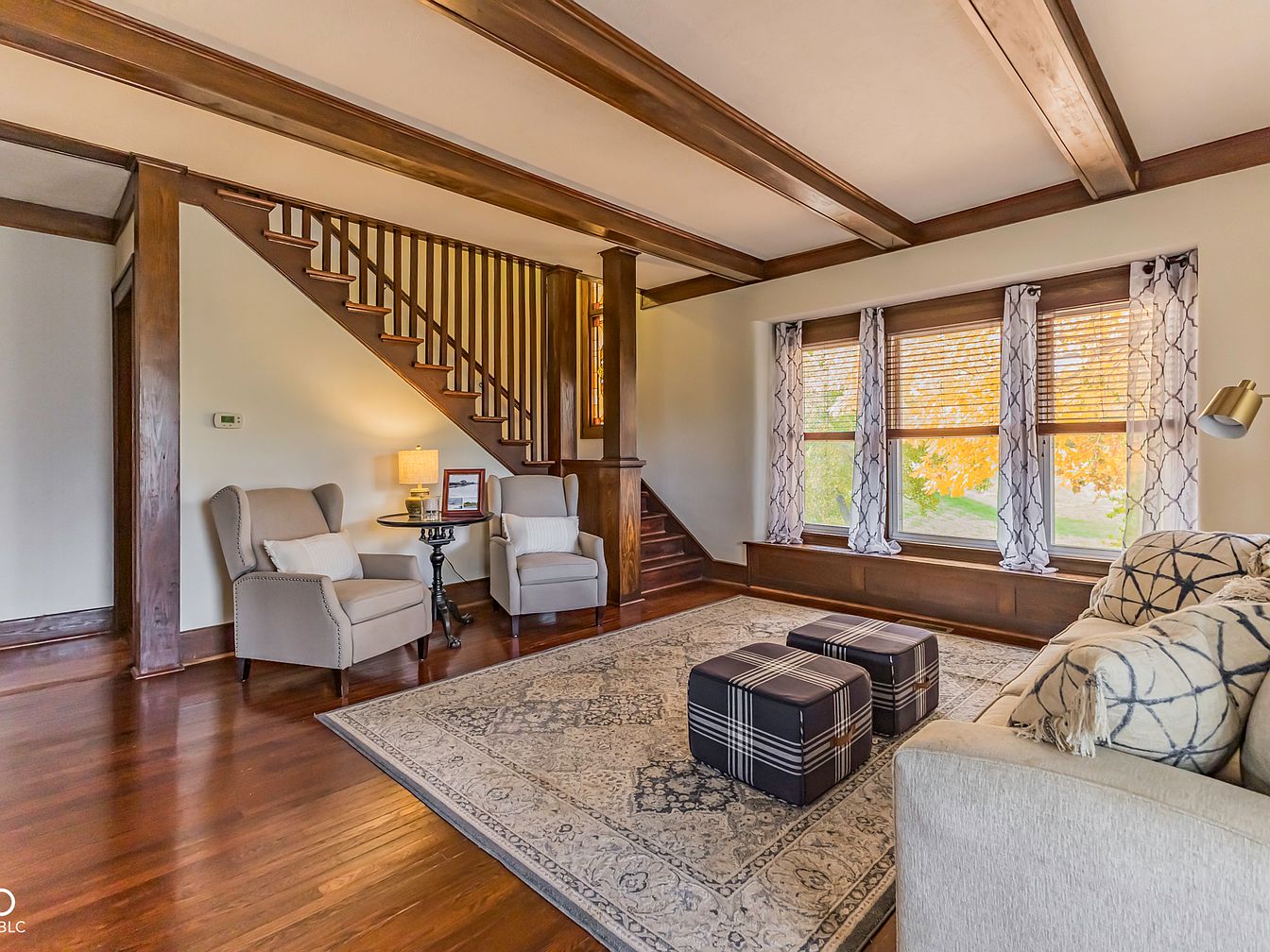 A spacious living room features rich wood flooring, exposed ceiling beams, and a dramatic wooden staircase with vertical slats, adding character to the space. Two comfortable beige armchairs flank a small round table with a lamp, creating an inviting reading nook by the stair landing. Large windows along one wall allow natural light to flood the area, enhanced by geometric patterned curtains and wooden blinds. A soft, patterned area rug centers the room, complementing a light-colored sofa with decorative pillows and two plaid ottomans that add a touch of classic style. Warm, earthy tones create a cozy, historic ambiance.