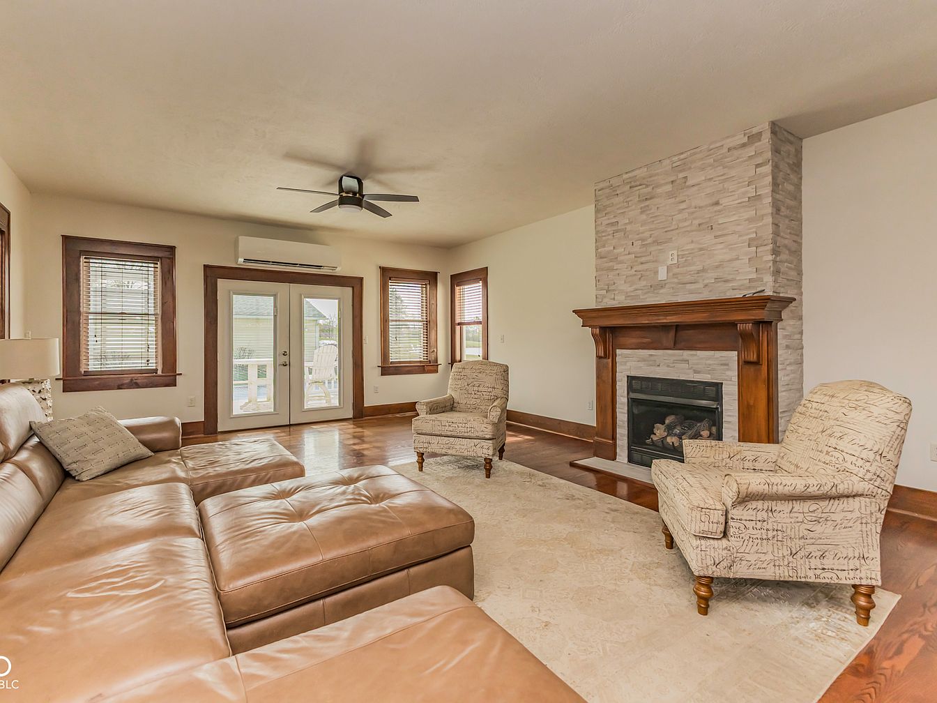 A spacious living room featuring a neutral color scheme with taupe walls, medium-toned wood trim, and wooden floors. Natural light pours through multiple windows with matching wood trim. The room centers around a modern fireplace finished with contemporary stacked stone and a classic wood mantle. There’s a large L-shaped tan leather sectional adorned with a textured throw pillow, and two accent chairs upholstered in a script-patterned beige fabric. Double glass doors, topped by an air conditioning unit, lead outside. Overhead, a sleek black ceiling fan provides a modern touch, complementing the airy, comfortable atmosphere.