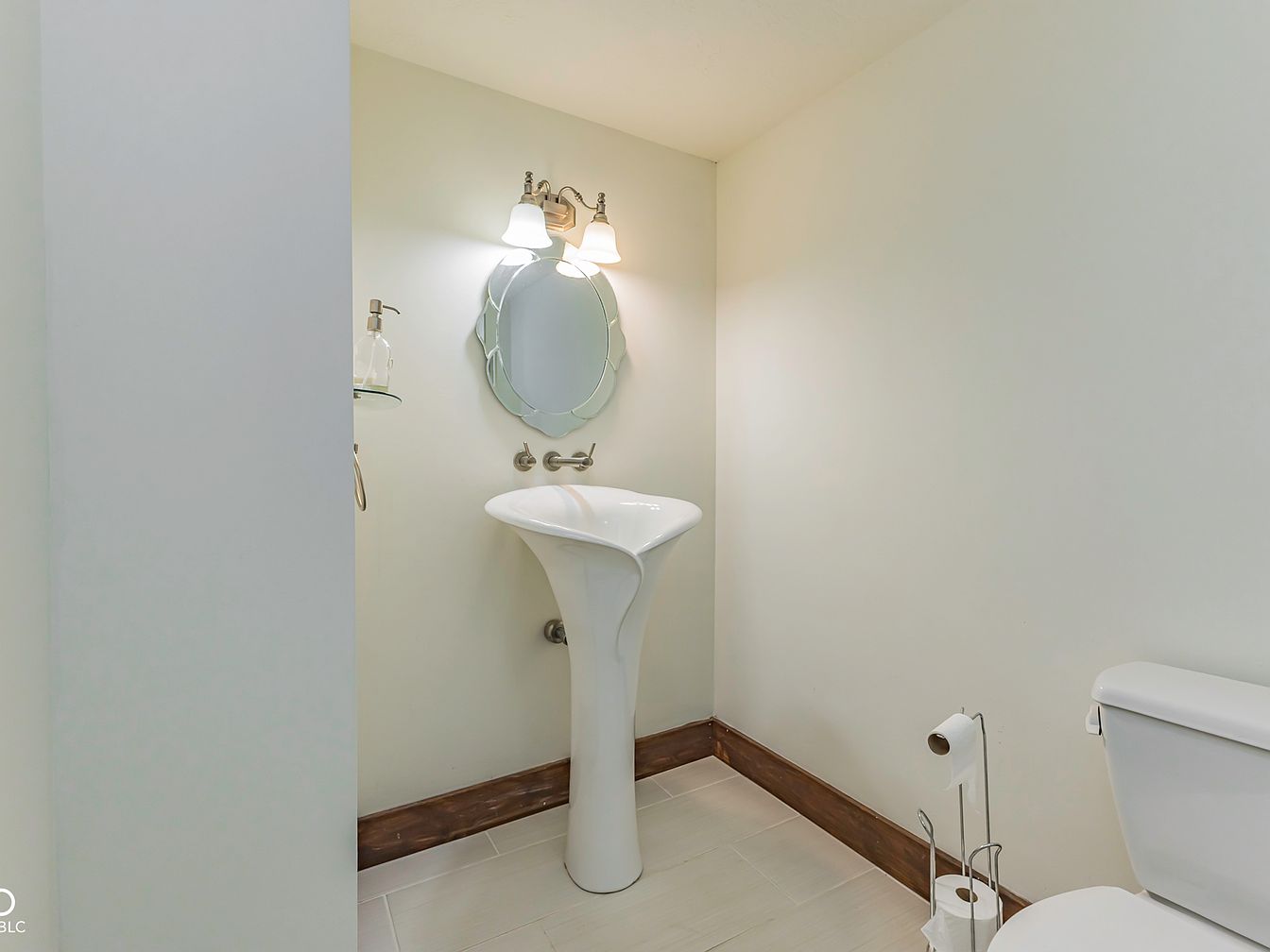 A small powder room with minimalist design features light beige walls and a sleek pedestal sink situated beneath an oval, beveled-edge mirror. Above the sink, twin sconce lights with frosted bell-shaped shades emit a gentle glow. The flooring is pale, rectangular tile, bordered by dark wooden baseboards that add a touch of warmth to the otherwise neutral palette. To the right, a classic white toilet stands next to a simple metal toilet paper holder. The overall atmosphere feels clean, airy, and functional, with understated elegance defined by curved lines and uncluttered surfaces, capturing a sense of refined simplicity.