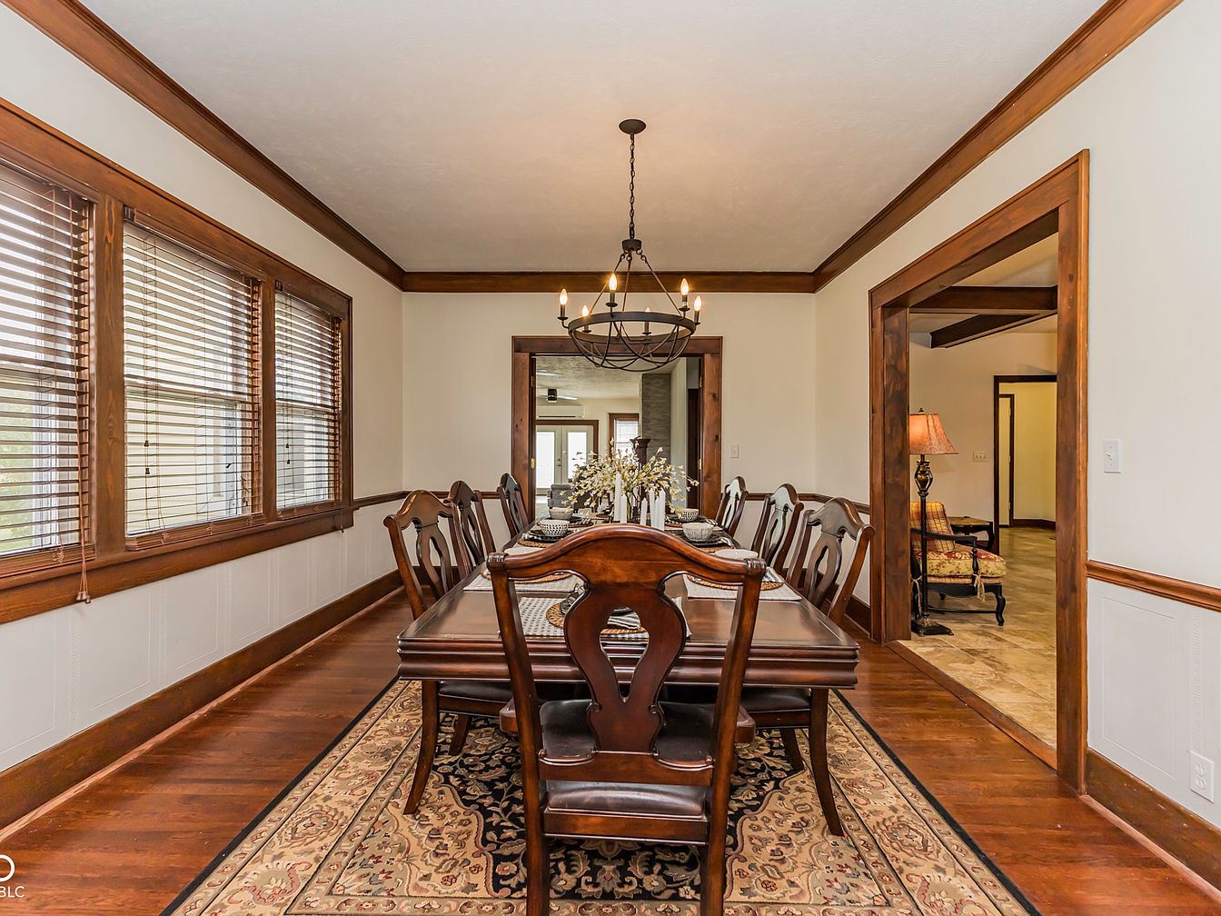 A long, rectangular wooden dining table sits at the center of the room, surrounded by eight matching wooden chairs with intricate backs. A traditional patterned rug anchors the furnishings, while the floor and window trim feature rich, medium-toned wood. Multiple large windows line the left side with wooden blinds, letting in natural light. The walls are painted a light cream, complemented by wood wainscoting and trim that enhances the classic style. Overhead, a wrought iron chandelier creates a focal point, adding rustic charm. Decorative table settings and a floral centerpiece complete the setup, conveying a warm and inviting ambiance.