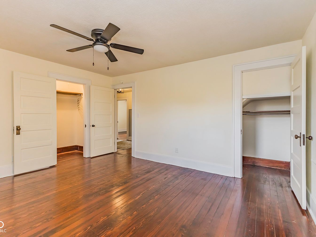 A spacious bedroom with rich, dark wooden flooring contrasting softly against creamy, off-white walls. Two large closets with white paneled doors are open, revealing ample shelving and wooden rods for hanging clothing. The room features a black ceiling fan with a central light fixture, providing both modern functionality and subtle style. Molded white trim lines the baseboards and door frames, adding to the historic character of the space. Both closets are deep, suggesting plenty of storage. Natural light fills the room, enhancing its airy and clean atmosphere, while the simple, classic aesthetic reflects timeless American craftsmanship.
