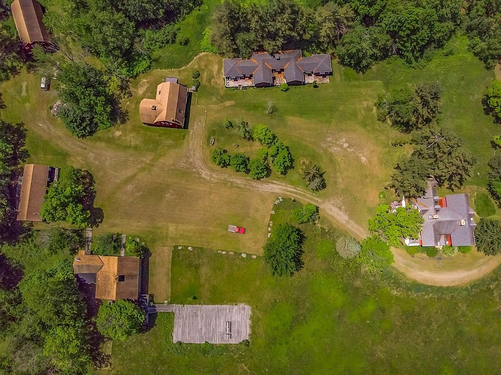 A historic American home is viewed from above, revealing its unique architectural layout surrounded by lush greenery. The roof is a complex shape with multiple gables and dormers, emphasizing traditional craftsmanship. Mature trees frame the property, casting shadows over portions of the house and lawn. A curved, well-trodden dirt driveway wraps gracefully around the front, bordered by manicured hedges and bushes, giving a sense of tranquility and privacy. The setting is rural and spacious, with vast expanses of grass and open land encircling the home. The house’s large footprint hints at numerous rooms and a significant historical presence.