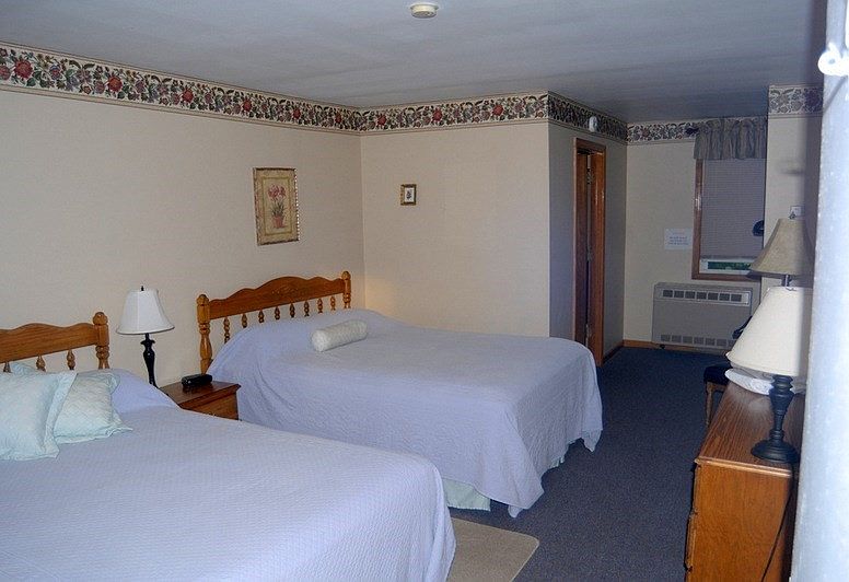This bedroom features two queen-sized beds with matching light wood headboards and pale lavender bedspreads. Each bed is accompanied by a small wooden nightstand, each with a traditional lamp. The walls are painted a soft beige and are topped with a floral wallpaper border for a touch of vintage charm. There are framed prints on the walls, adding to the homely decor. Along the far wall, a wooden dresser provides additional storage space, topped with another lamp. The room feels spacious and uncluttered, with muted carpeting and a large window letting in natural light, partially covered by a matching valance.