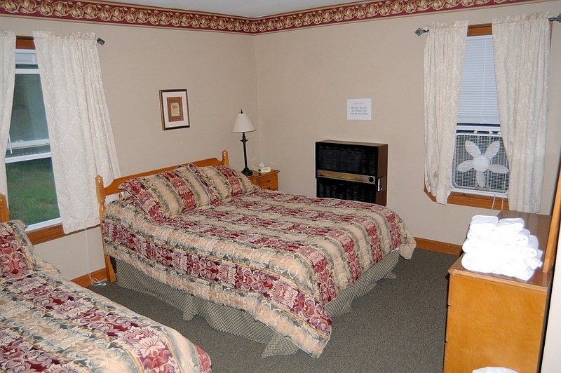 A cozy guest bedroom featuring two beds with matching floral bedspreads in warm tones of burgundy, tan, and olive. The space uses soft beige walls accented by patterned wallpaper trim along the ceiling, and two large windows with cream lace curtains allowing natural light to filter in. One nightstand with a white lamp sits between the beds, and a wooden dresser holds a neatly folded stack of white towels. A vintage black heater is situated beneath a window fitted with a box fan, adding to the practical, welcoming charm of the room. The carpet is a muted green, complementing the earthy palette.