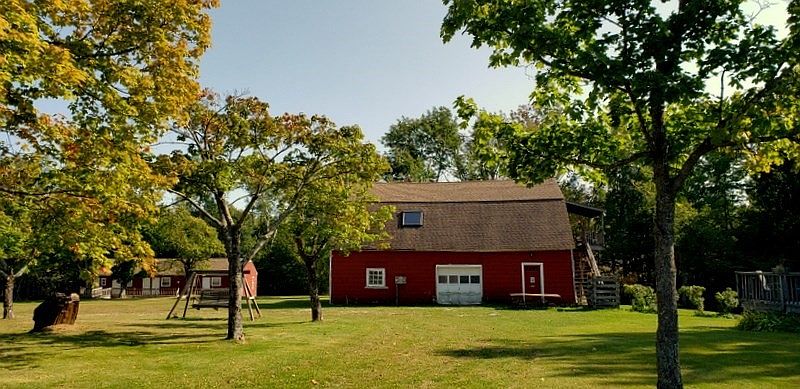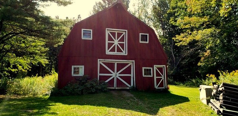 A large, traditional red barn stands in a grassy clearing, surrounded by tall trees and lush greenery. The barn’s surface is painted deep red with crisp white trim outlining the doors and windows, framed in an iconic crossbuck pattern. The main double doors are positioned at the center, above which sits a smaller set of loft doors, also accented with white trim. A few small windows dot the structure, letting in natural light. The sunlight filters through leafy trees, casting patches of shade and adding to the rustic, tranquil charm of this historic rural property.