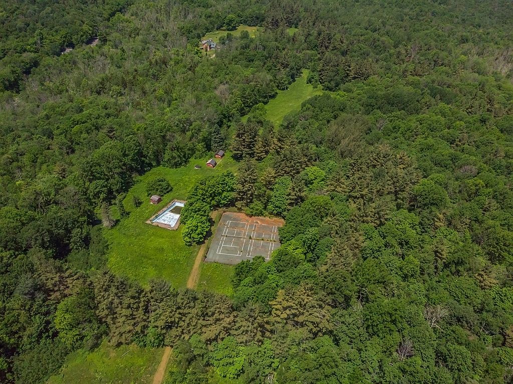 An expansive aerial view reveals a lush woodland estate surrounded by dense green forest. In the foreground, a rectangular swimming pool with a white border sits in a grassy clearing. Nearby, several small outbuildings or cabins dot the landscape, each with dark red or brown roofs. Adjacent to the pool, a large faded tennis court is partially shaded by tall trees. Winding pathways weave through the greenery, and further in the distance rests a main house and more open grass fields, showcasing the property’s serene and private setting nestled deep within the woods.