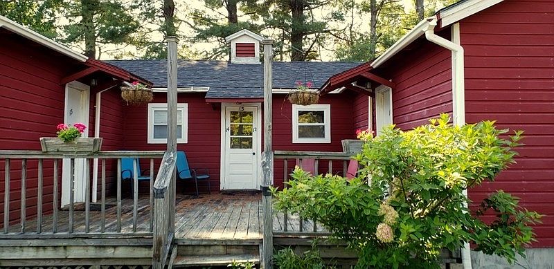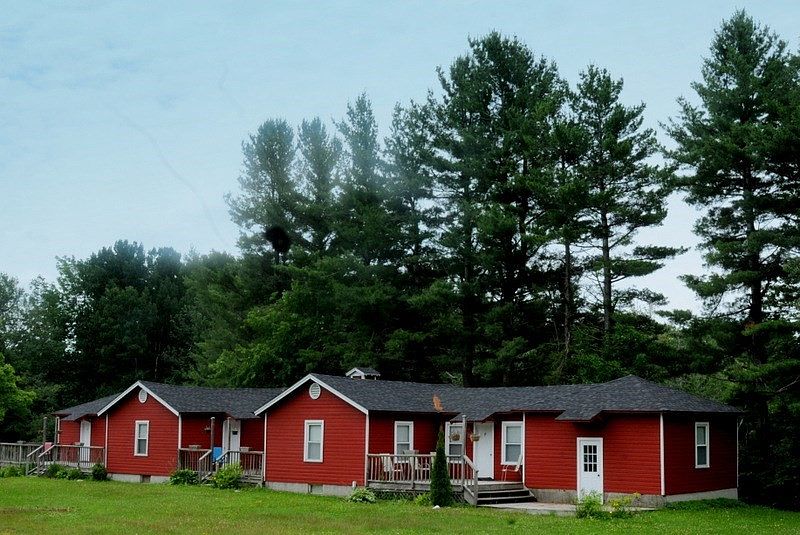 A single-story red clapboard cottage is nestled among tall green trees, creating a cozy and inviting look. The house has a light brown shingle roof and a simple rectangular shape. The front is lined with several evenly spaced white-framed windows and white doors, each accented by a modest front porch with a wooden railing. A lush green lawn stretches out before the house, while the thick foliage and surrounding forest provide shade and privacy. The restrained color palette highlights classic rural American charm and blends harmoniously with the natural landscape.