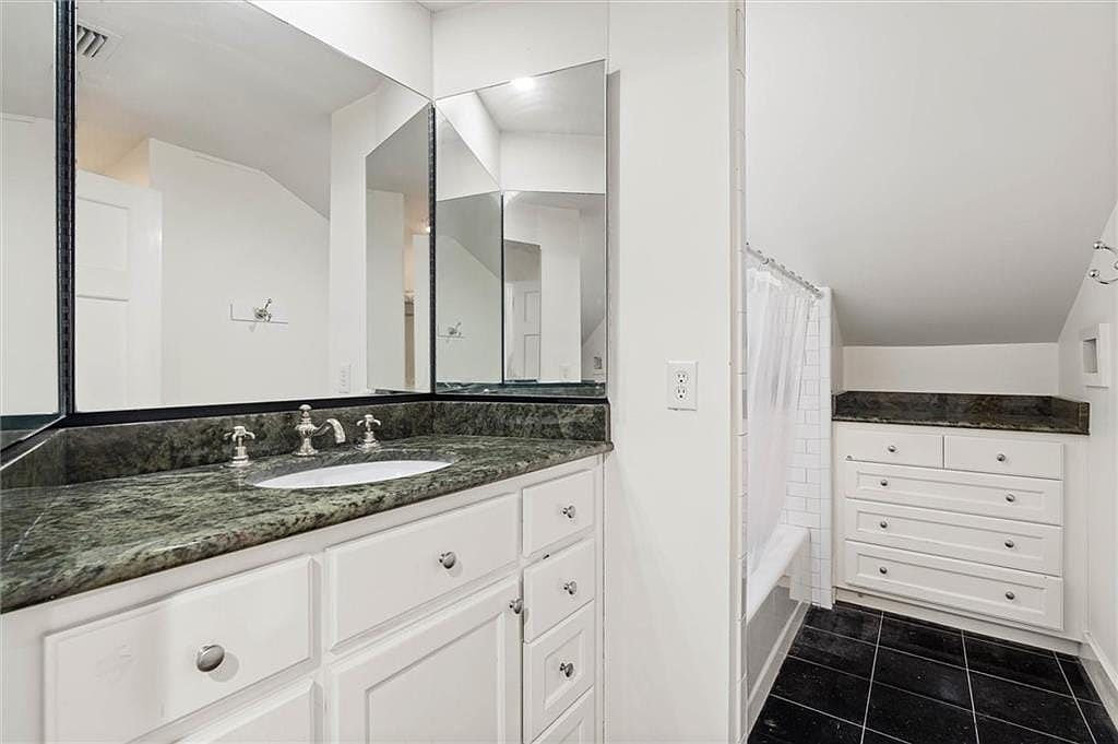 A bathroom featuring a corner vanity area with dark green marble countertops, polished silver fixtures, and white cabinetry. Large mirrors line the walls above the sink, creating a sense of space and brightness. The room has crisp white walls and black floor tiles that add a modern, contrasting touch to the otherwise classic palette. In the background, a white bathtub with a shower curtain sits under a sloped ceiling, and more white drawers with matching marble countertops create extra storage space. The overall look is clean, minimalist, and sophisticated, combining traditional cabinetry with contemporary finishes.