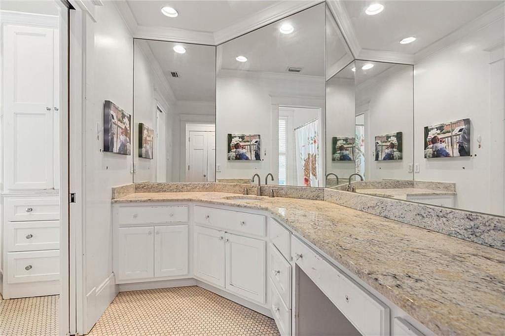 A spacious bathroom corner features a large L-shaped granite countertop with dual sinks and white cabinetry beneath. The walls are painted a crisp white, matching the cabinets, and the ceiling is finished with crown molding. Two expansive mirrors meet at a corner, visually enlarging the space and reflecting light from recessed ceiling fixtures. The floor is covered in small, cream-colored hexagonal tiles that add a vintage touch. Simple modern art is mounted on the wall above the sinks, and the room has a serene, clean feel, blending traditional elegance with contemporary accents.