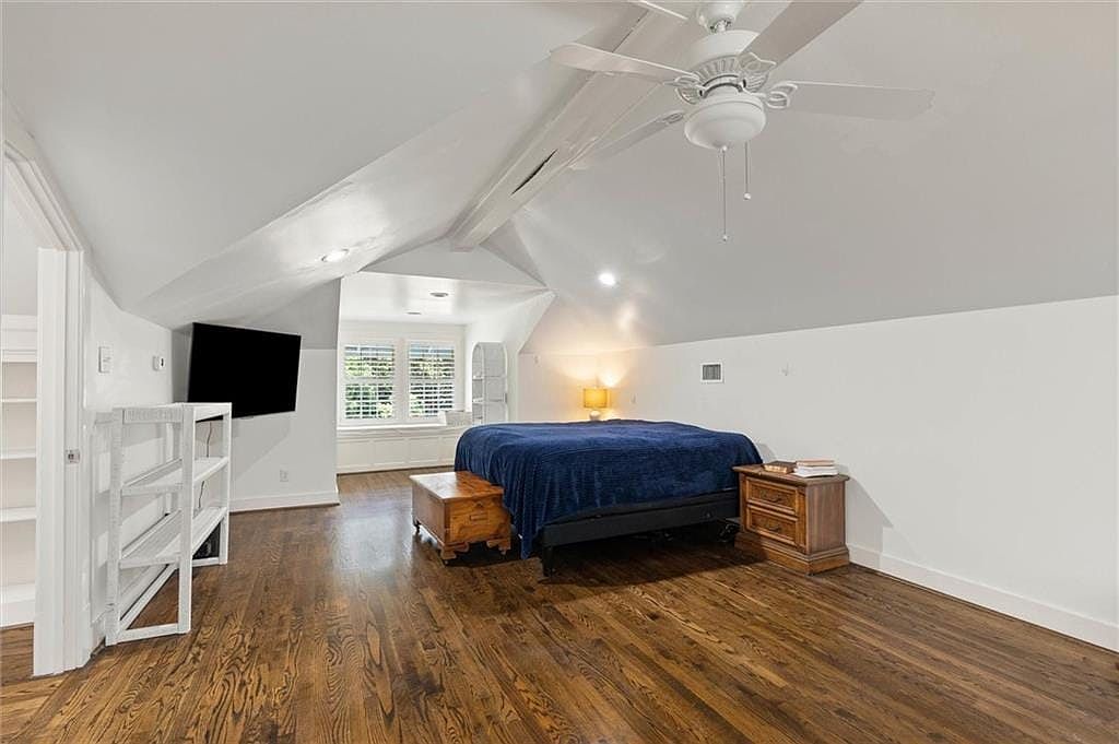 A spacious attic bedroom with vaulted ceilings painted in crisp white, adding to the airy, open feel. Rich wooden floors bring warmth and depth to the room, while a large bed with a navy blue cover serves as the main focal point. At the foot of the bed sits a wooden chest. Matching nightstands with a lamp and books flank the bed. A white ceiling fan is centrally placed for comfort. Built-in shelving, a wall-mounted television, and a long window seat under three wide windows fill the far wall, inviting natural light into the serene space. Minimalist touches evoke cozy sophistication.