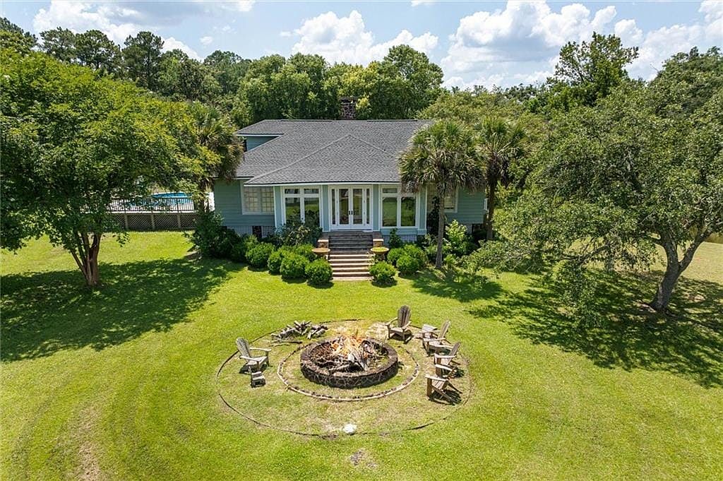 A historic home’s spacious front yard features a central circular fire pit surrounded by rustic Adirondack chairs arranged for social gatherings. Stonework forms the perimeter of the fire feature, set on neatly trimmed, vibrant green grass. Mature trees, including palm and deciduous varieties, shade parts of the lawn and add a lush, established feel. Wooden entry steps lead up to a wide, welcoming porch with tall glass doors and white columns, while symmetrical landscaping frames the approach with manicured bushes. The house itself is painted a soft, muted blue-gray, crowned by a dark shingle roof and accented by crisp, white trim.