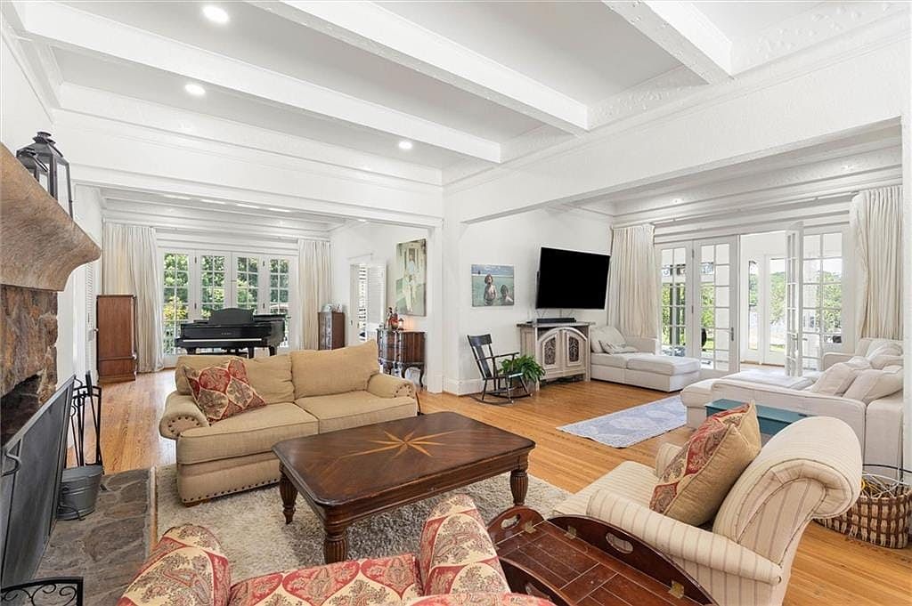 A spacious and inviting living area features exposed white ceiling beams, which add architectural charm and height to the room. Warm wooden floors are softened by rugs beneath upholstered armchairs and a beige sofa with decorative pillows. A stone fireplace anchors one side, while a large, dark wood coffee table sits centrally. The adjacent area includes a grand piano and a mix of classic wooden furniture. Walls and trim are painted white, complemented by floor-length cream curtains framing multiple French doors and windows that invite natural light. The overall effect is bright, airy, and elegantly traditional.