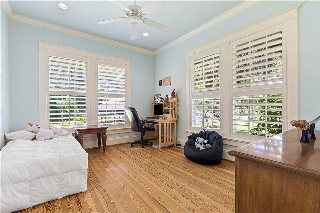 A bedroom with cheerful, light blue walls and warm, wide-planked wood flooring. The bed rests low to the floor, dressed in a fluffy white comforter and adorned with stuffed toys, creating a cozy nook in one corner. Large windows line two walls, fitted with white plantation shutters that welcome abundant natural light, enhancing the airy feel of the space. Across the room, a simple wood desk and modern black office chair are positioned for a compact workspace. A soft, dark bean bag with plush toys adds a playful touch, while a sturdy wooden dresser sits in the foreground, completing the room’s classic yet inviting ambiance.
