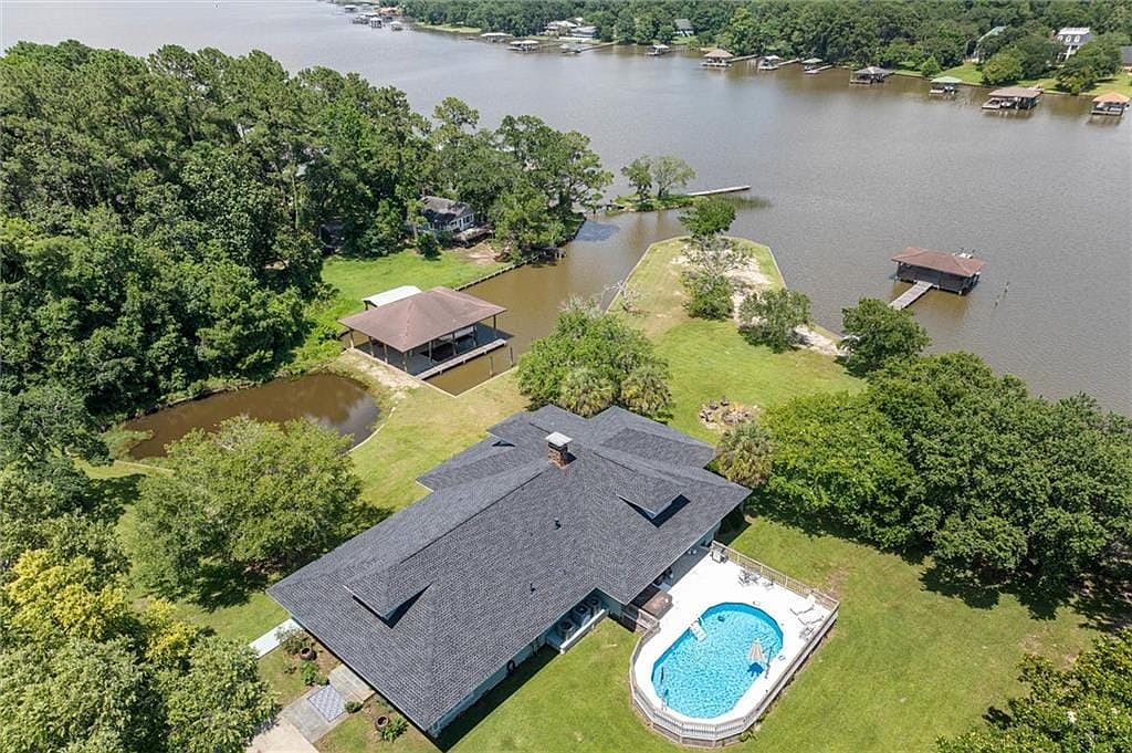 A sprawling backyard sits along the edge of a tranquil river or large lake, bordered by lush green trees and open grassy areas. The property features a rectangular, dark-roofed home with an inviting oval swimming pool enclosed by a white fence. A private dock stretches out into the water, and there is a covered boat house with tin roofing nearby. The grounds are landscaped with clusters of mature trees and open lawns, offering both shade and sunlight. This setting conveys a peaceful, secluded retreat designed for relaxation and enjoying the scenic waterfront views.