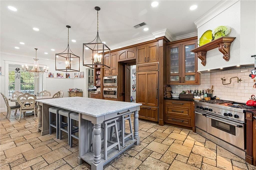 Bright, spacious kitchen featuring a large marble-top island at the center with four stools tucked underneath. The island rests on turned wooden legs and is painted a soft gray, contrasting with the surrounding rich wooden cabinetry. Two oversized, geometric iron lanterns hang above the island, adding a touch of elegance. Natural stone flooring in a herringbone pattern complements the neutral palette. To the right, a professional-grade stainless steel range sits beneath a decorative wood shelf, with white subway tiles and a brass pot filler on the backsplash. A cozy breakfast nook with ornate chairs and a round table is visible in the background.