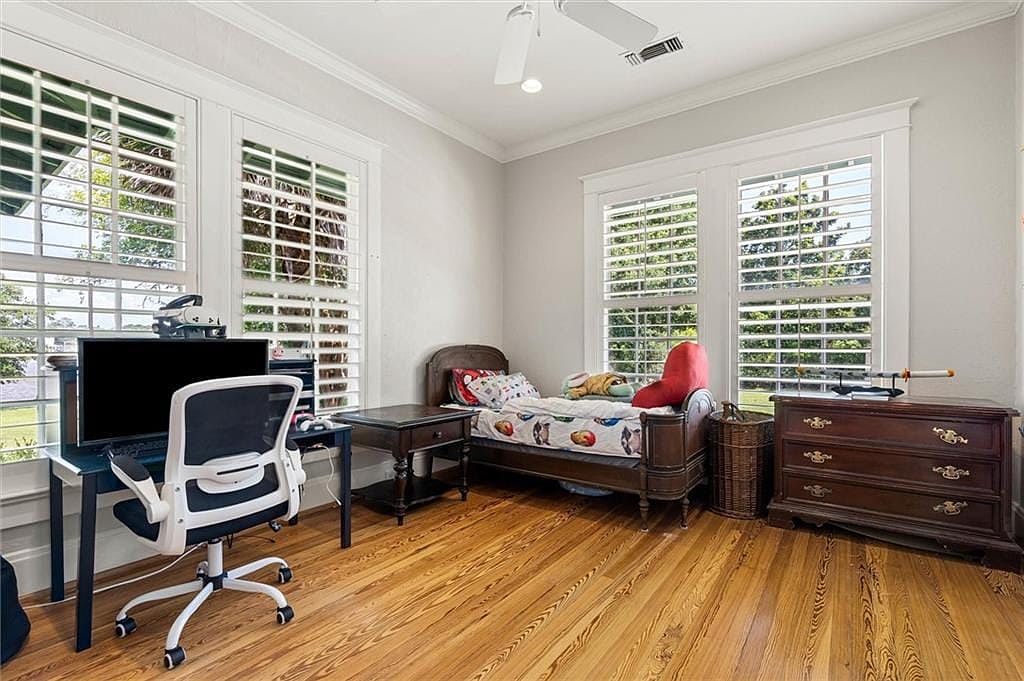 A sunlit corner of a bedroom that combines adult and child-friendly elements, featuring a single bed with animal-printed bedding and a plush red backrest. Beside the bed stands a dark wooden nightstand and an old-fashioned dresser with brass drawer pulls, adding a vintage touch. The workspace includes a modern desk and office chair, set against three large windows with crisp white plantation shutters that bathe the space in natural light. The pale gray walls and white crown molding provide a calm backdrop, while the honey-toned hardwood floor enhances the classic, welcoming aesthetic. Simple, functional, and slightly eclectic.