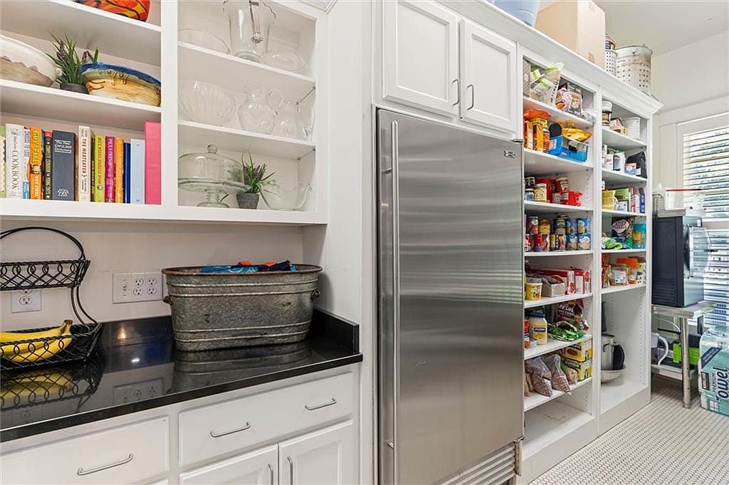 A spacious pantry features crisp white built-in shelves and cabinetry, creating an organized and bright backdrop. Glassware, cookbooks, and small decorative plants add personality and color to the upper open shelves, while a glossy black countertop offers space for food prep or storage. Large metal bins and fruit baskets provide rustic charm and practicality. The stainless steel refrigerator anchors the center of the room, flanked by tall pantry shelves neatly stocked with cans, jars, and boxed goods for easy access. Natural light filters in from a nearby window, highlighting the cleanliness and functionality of the space.