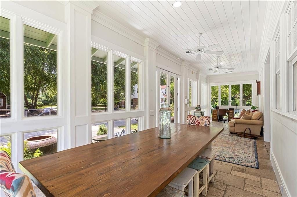 A bright, airy sunroom stretches the length of the house, filled with natural light from a long wall of large windows framed in crisp white trim. The floor is made of beige stone tiles, and a ceiling with white horizontal paneling features two white ceiling fans. A rustic wooden dining table, adorned with glass jars, runs parallel to the windows and is surrounded by eclectic, upholstered chairs. Toward the far end is a cozy sitting nook with a beige sofa, colorful rug, potted plants, and a small wood writing desk, all creating a relaxed, inviting atmosphere that blurs indoor and outdoor living.