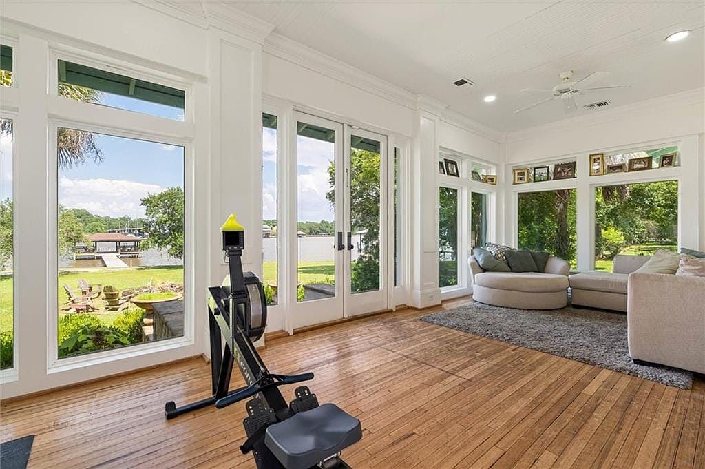 A bright and airy sunroom with expansive floor-to-ceiling windows provides sweeping views of a lush riverside landscape and a manicured lawn outside. The space features gleaming, honey-toned hardwood floors and crisp white trim, lending a fresh and classic ambiance. A compact rowing machine sits near the windows, blending fitness with relaxation. A cozy, round grey sectional sofa with plush throw pillows sits atop a soft, textured area rug, creating a comfortable seating area. Natural light pours through the windows, highlighting framed photos displayed along a window ledge, while overhead recessed lighting and a ceiling fan add function and style.