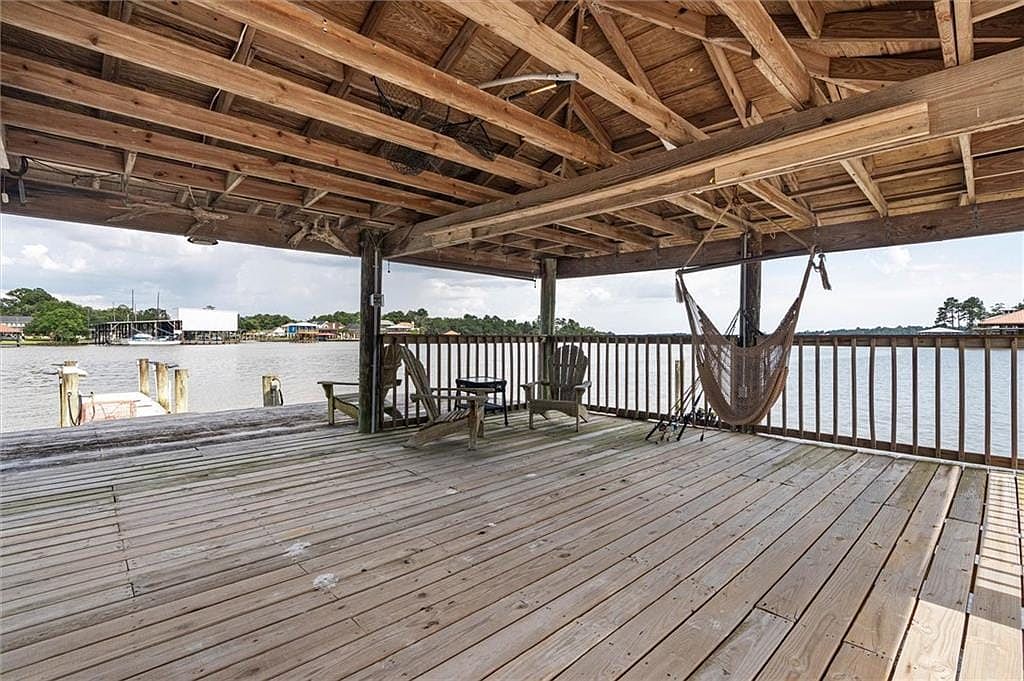 A spacious wooden deck sits over the water, covered by an open beam timber roof with exposed rafters for a rustic, airy feel. The weathered plank floor extends to a railing that wraps around the patio, offering unobstructed views of a calm river and distant tree-lined banks. Comfortable Adirondack chairs and a hanging mesh hammock create a relaxed, lakeside retreat atmosphere. Fishing rods lean casually against a post, hinting at leisurely water activities. The natural wood tones dominate, blending seamlessly with the surrounding water and greenery, evoking a laid-back, coastal lifestyle perfect for relaxing or fishing.