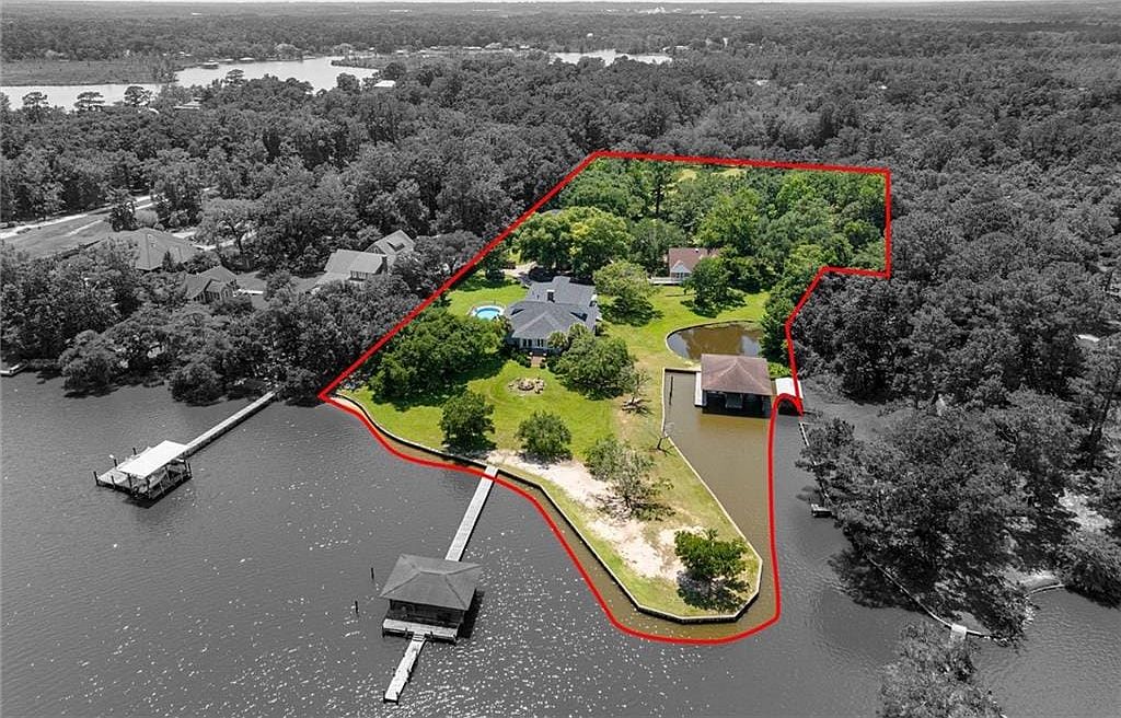 Spacious lakefront estate surrounded by dense trees, outlined with a bold red border indicating property lines. The property features a large main house centrally located, with a circular driveway and lush green lawns dotted with mature trees. There is an inviting swimming pool behind the house, providing a recreational focal point. Multiple covered docks and piers extend into the water, enhancing access to the lake and creating a serene, secluded retreat. Auxiliary structures are visible near the water’s edge, suggesting boathouse or guesthouse use. The entire scene evokes privacy and tranquility with old-growth forest and winding shorelines.
