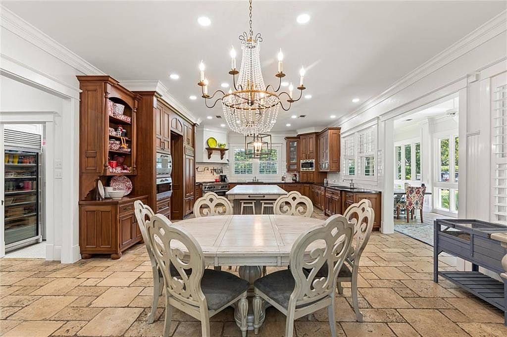 An elegant kitchen features a central dining area with a pale wood table and intricately carved chairs with dark cushions. Large stone tile floors and classic millwork create a warm, inviting space. Extensive wood cabinetry lines the walls, offering open shelving for dishes and closed storage, accented by crown molding. The neutral color palette is highlighted with soft whites and honeyed wood tones. A crystal chandelier hangs above the dining table, adding a touch of luxury. Tall windows with plantation shutters bathe the room in natural light, while an adjoining room with colorful chairs extends the living area.