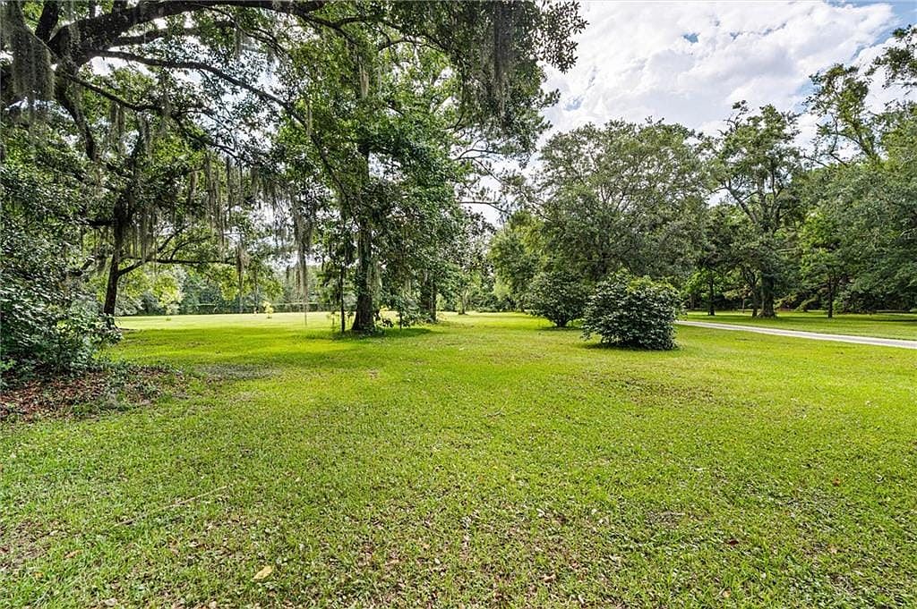 A sprawling green lawn stretches toward the horizon, dotted with mature trees draped in hanging Spanish moss. Manicured shrubs and small bushes create subtle points of interest, while the dense foliage along the far edges frames the open space. A curving driveway runs along the right, dividing the grassy expanse from more wooded areas in the background. The soft, natural light filtering through the trees highlights the vibrant greens and casts dappled shadows, giving the landscape a serene and timeless Southern charm. The overall view conveys a peaceful, well-maintained outdoor environment perfect for relaxation and leisure.