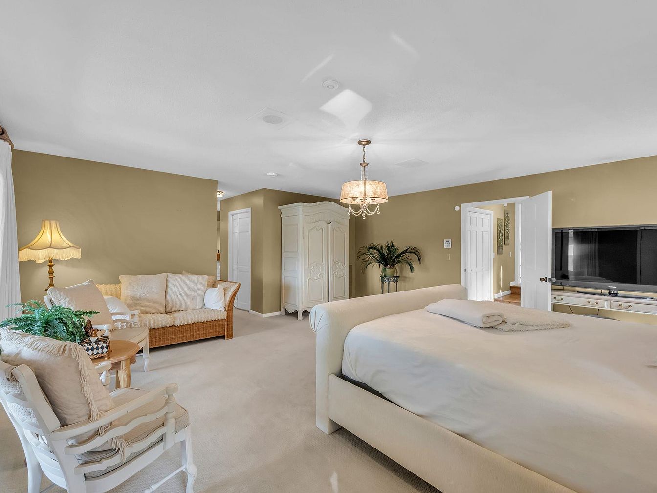 A spacious bedroom with a soft, neutral color palette, featuring light beige carpet and olive-toned walls. The room includes a large upholstered bed with cream bedding, positioned centrally under a classic chandelier. Opposite the bed, a long dresser supports a flat-screen TV. In a cozy sitting nook, a wicker loveseat, vintage floor lamp with a fringed shade, and white armchairs surround a small round table with houseplants, lending a warm, inviting ambiance. An ornate antique armoire and a potted palm add touches of classic and natural decor. Ample natural light streams through large windows with sheer curtains.