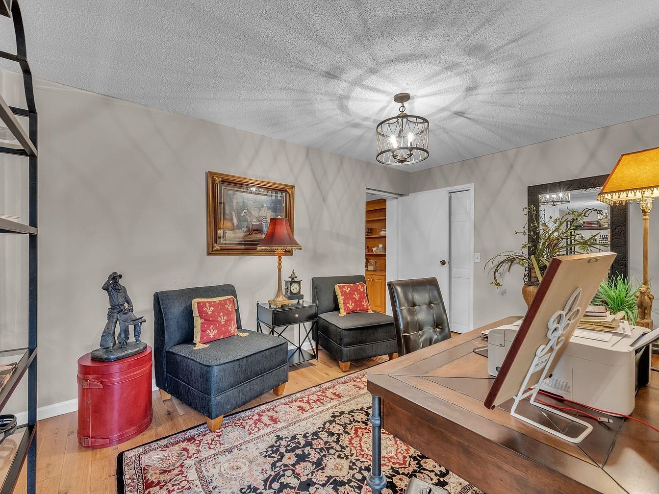 A well-appointed home office space features a wood desk situated on a richly detailed area rug with intricate black, red, and beige patterns. To the left, two deep blue-gray accent chairs with red and gold throw pillows are against a pale gray wall, flanked by a black side table topped with a red lamp and a statue. Overhead, a geometric light fixture casts a unique shadow design on the textured ceiling. On the right, a large potted plant and gold-accented lamp adorn the desk. Wall art and a large mirror add both character and depth, creating a sophisticated yet inviting setting.