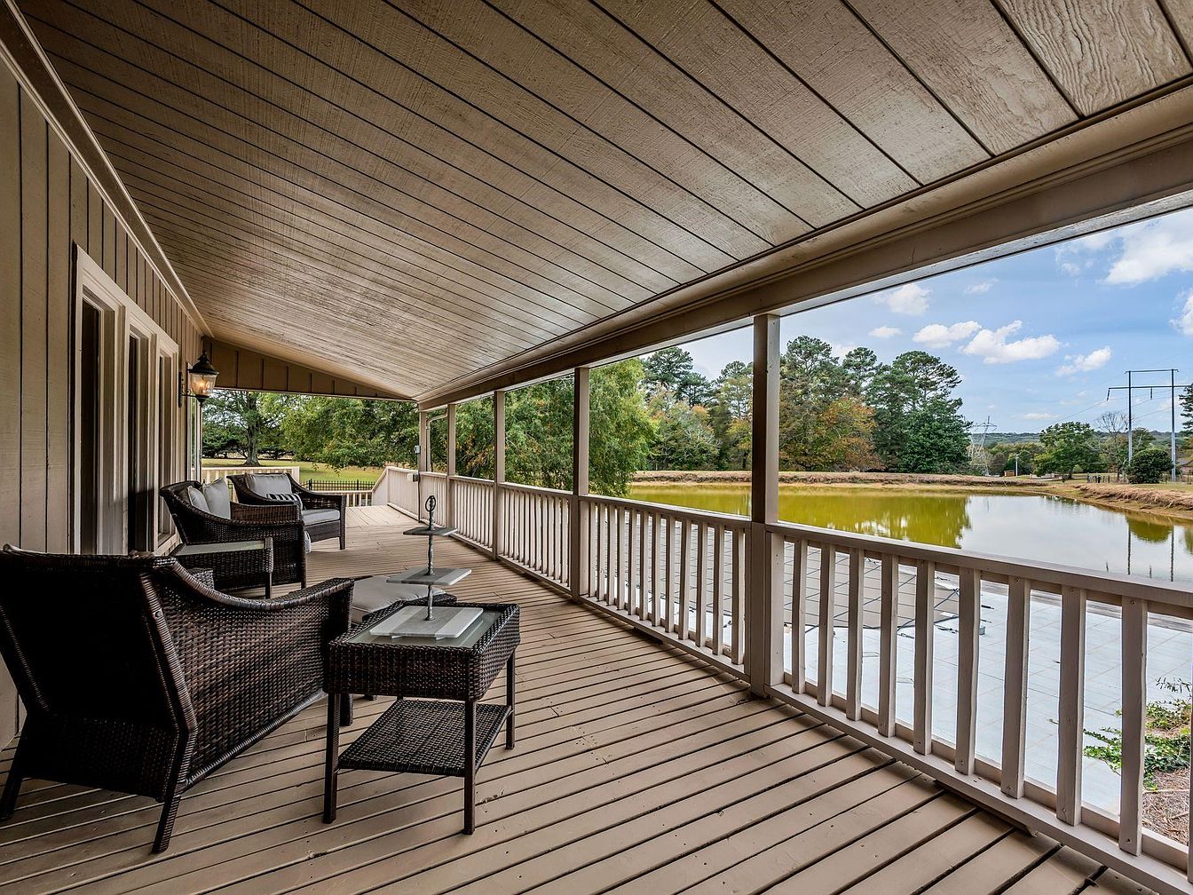 A spacious, covered front porch with a slanted wood-paneled ceiling and matching wooden decking runs along the length of the house. Comfortable dark wicker chairs and a small side table are neatly arranged, inviting relaxation and conversation. The porch railing is classic white, offering a safe boundary and a picturesque frame of the view. Beyond the railing, a serene pond mirrors the sky, bordered by grassy banks and mature trees. The porch exudes a welcoming, rustic charm, combining natural materials and earthy colors with plenty of open space and tranquil scenery just a few steps away.