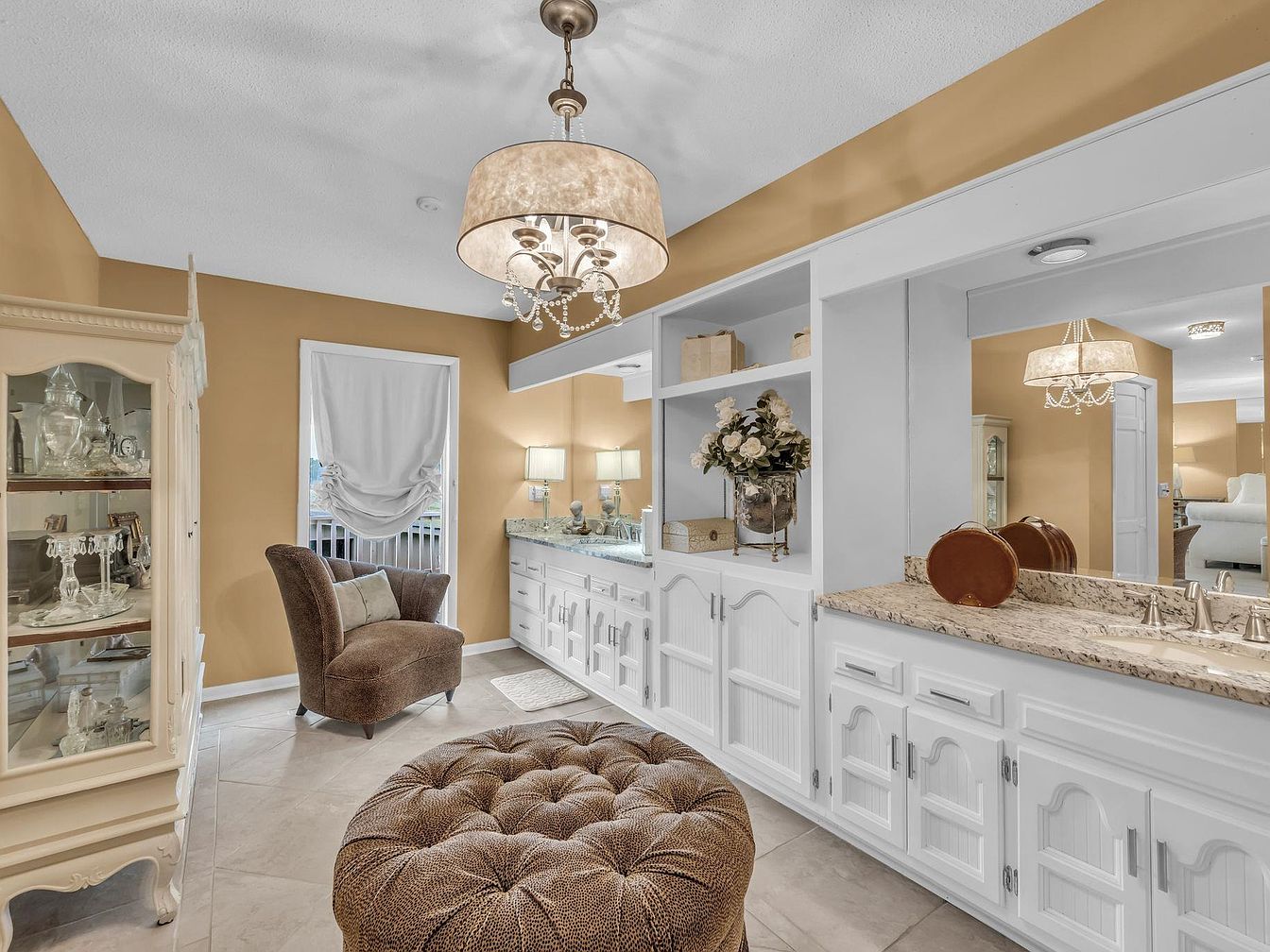 A spacious dressing area features a long marble-topped vanity with dual sinks and elegant white cabinetry. Above the sinks, open built-in shelves display decorative boxes and a large floral arrangement, while a large mirror reflects light throughout the space. Walls are painted a warm honey-gold, complementing the pristine white cabinetry and trim. A tufted ottoman upholstered in textured fabric serves as a central seating option, paired with a plush armchair and throw pillows by the window. A delicate glass-front china cabinet holds silver pieces, adding vintage charm. Soft lighting from the chandelier and wall sconces enhances the inviting, refined ambiance.