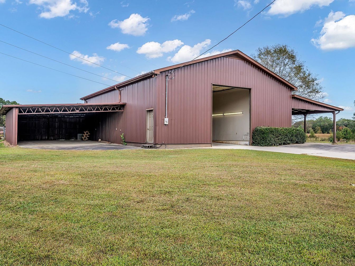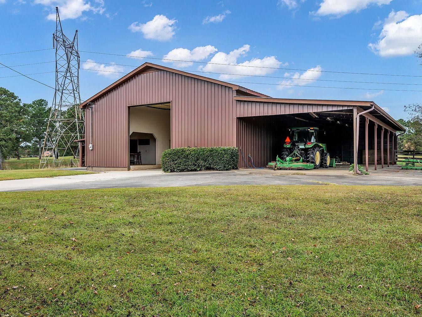 A large open-sided shed made of rust-colored metal panels, serving as a practical storage and work area on the property. The left section is an enclosed space, partially open, with a simple geometric cutout above the entrance. The right section is a covered area sheltering a green tractor, showcasing the building’s utilitarian farm function. Concrete extends from the entrance forming a clean driveway, bordered by neatly trimmed shrubbery. Overhead, electric power lines and a tall metal transmission tower rise behind the building, and the surrounding landscape features grassy lawns and scattered mature trees under a blue sky with puffy clouds.