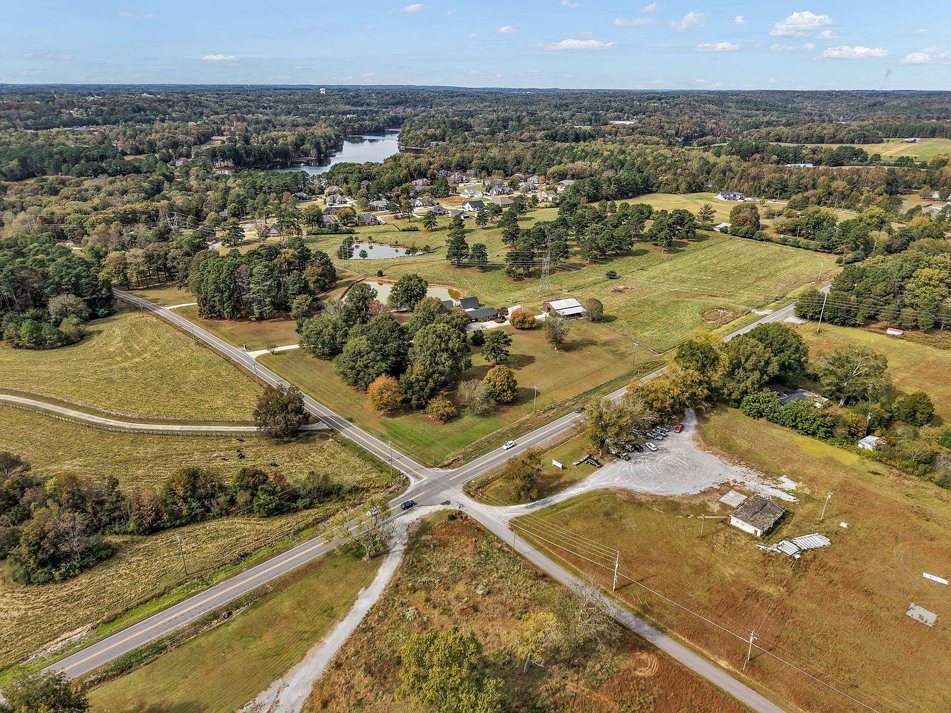 A broad aerial view highlights a sprawling rural property and its surrounding landscape. Large grassy fields bordered by fencing and tree-lined roads form a series of rectangles. Winding roads intersect through the property, connecting open fields, a few outbuildings, and clusters of mature trees. Several residential houses, barns, and outbuildings are scattered throughout, accompanied by ponds and wooded areas. The distant background features a lake, forests, and a small community with additional homes. The color palette is dominated by shades of green and brown, capturing the natural and tranquil character of the countryside under a blue sky dotted with clouds.