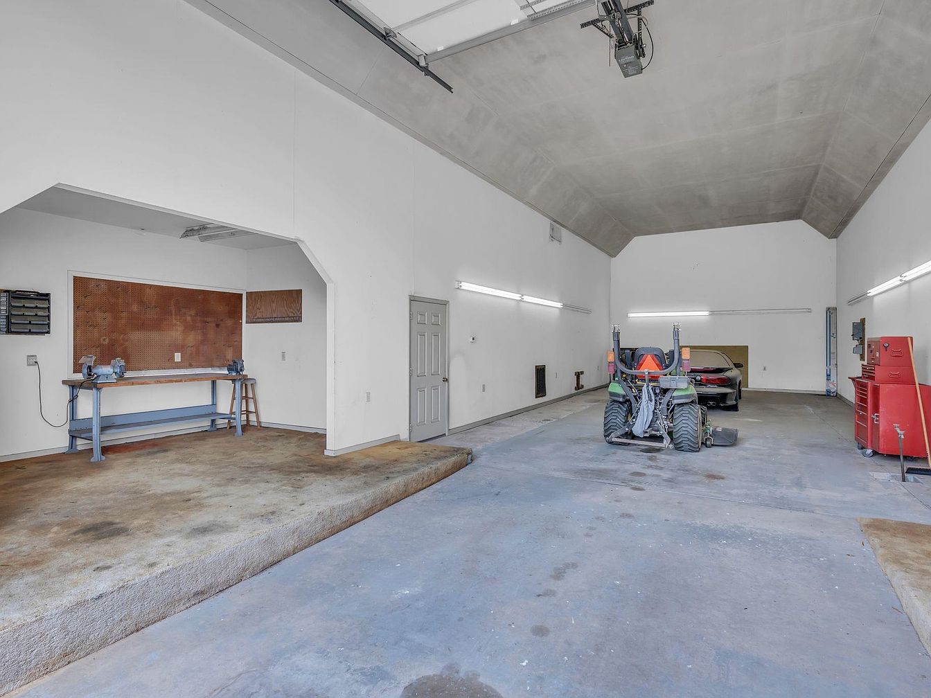 A spacious, high-ceilinged garage features an open layout with white walls and concrete flooring marked by patches and stains from past projects. The left side houses a raised platform with a large workbench, pegboard, and tool organizers, including a few small drawers and mounted equipment. There’s a utility stool under the bench and outlets along the wall for power tools. On the right, a red tool chest on wheels and agricultural machine sit alongside a parked car toward the rear. Long fluorescent lights run parallel down each wall, illuminating the practical and well-organized workspace designed for both vehicle storage and hands-on work.