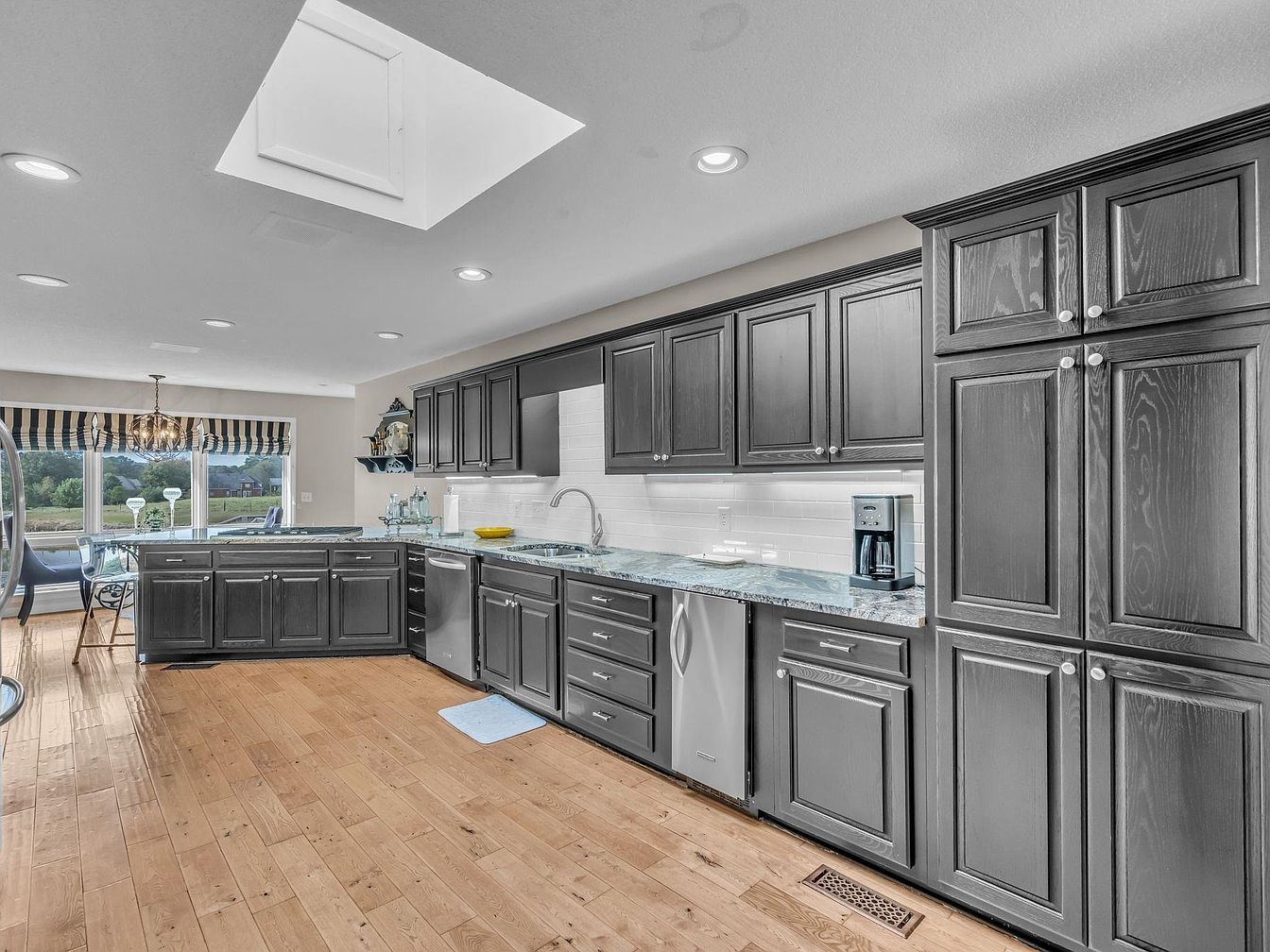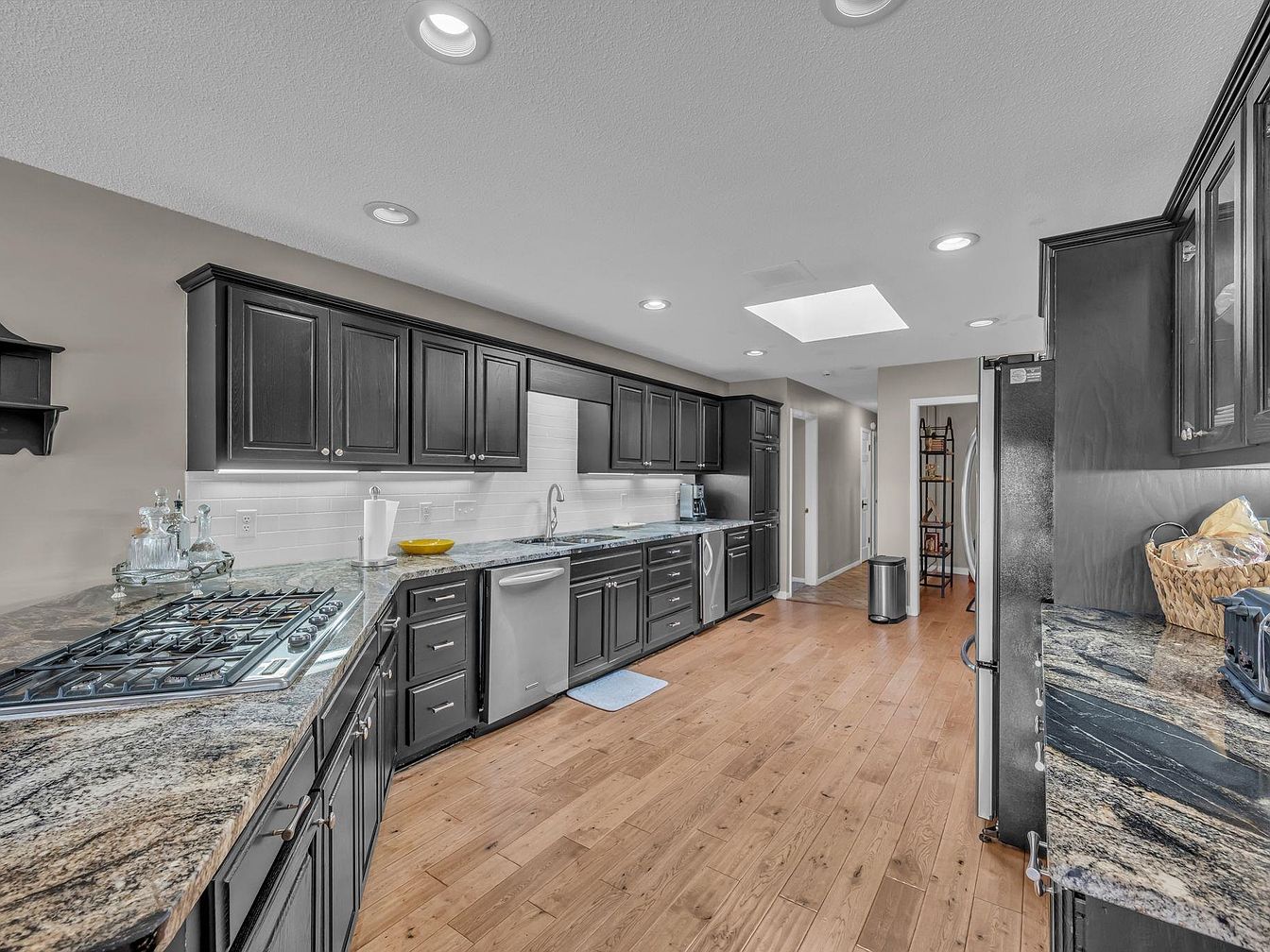 A spacious, galley-style kitchen with dark cabinets provides a striking contrast to the light hardwood floors and white-tiled backsplash. The countertops feature swirling granite patterns in shades of gray, brown, and cream, adding elegant texture. Stainless steel appliances, including a gas cooktop, dishwasher, and refrigerator, are integrated seamlessly. Recessed lighting in the ceiling creates a bright work environment, complemented by a large skylight for natural light. Simple, modern hardware on cabinets and a clutter-free design reflect a blend of classic and contemporary aesthetics. The overall color palette is neutral, grounding the space in sophistication and warmth.