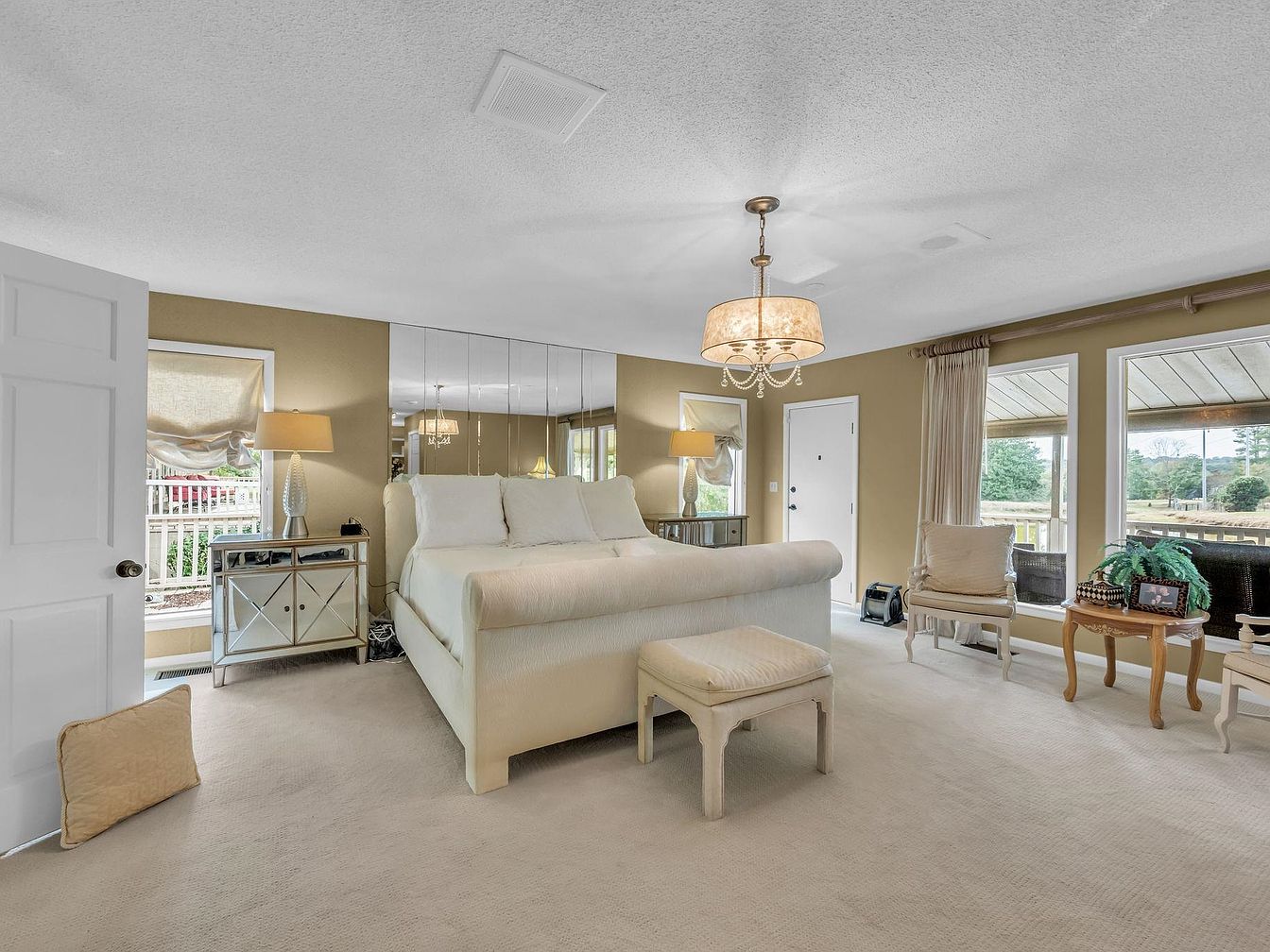 A spacious bedroom featuring a plush, cream-colored carpet and a large matching upholstered bed topped with crisp white pillows. The headboard is positioned against a wall clad in beveled mirrors, giving the room extra light and a sense of expansiveness. On each side of the bed sit mirrored nightstands with elegant table lamps casting a soft, warm glow. Neutral tan walls, ceiling molding, and a delicate chandelier suspended from the ceiling contribute to the calm atmosphere. Two windows with heavy drapes, a door, and light-finished accent furniture—including a bench and side table—offer a serene view of the outdoors.