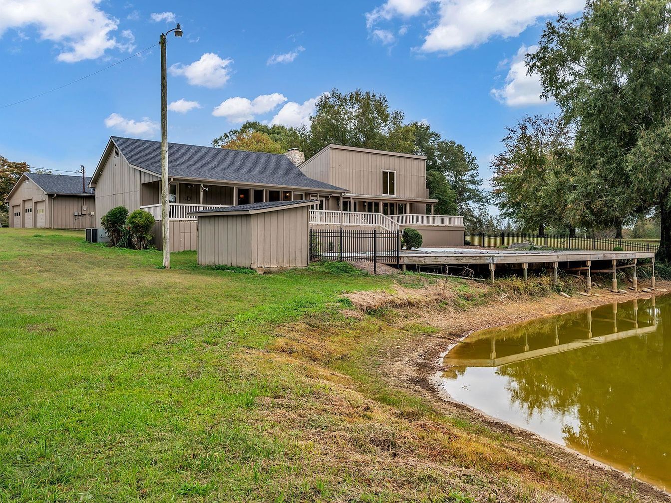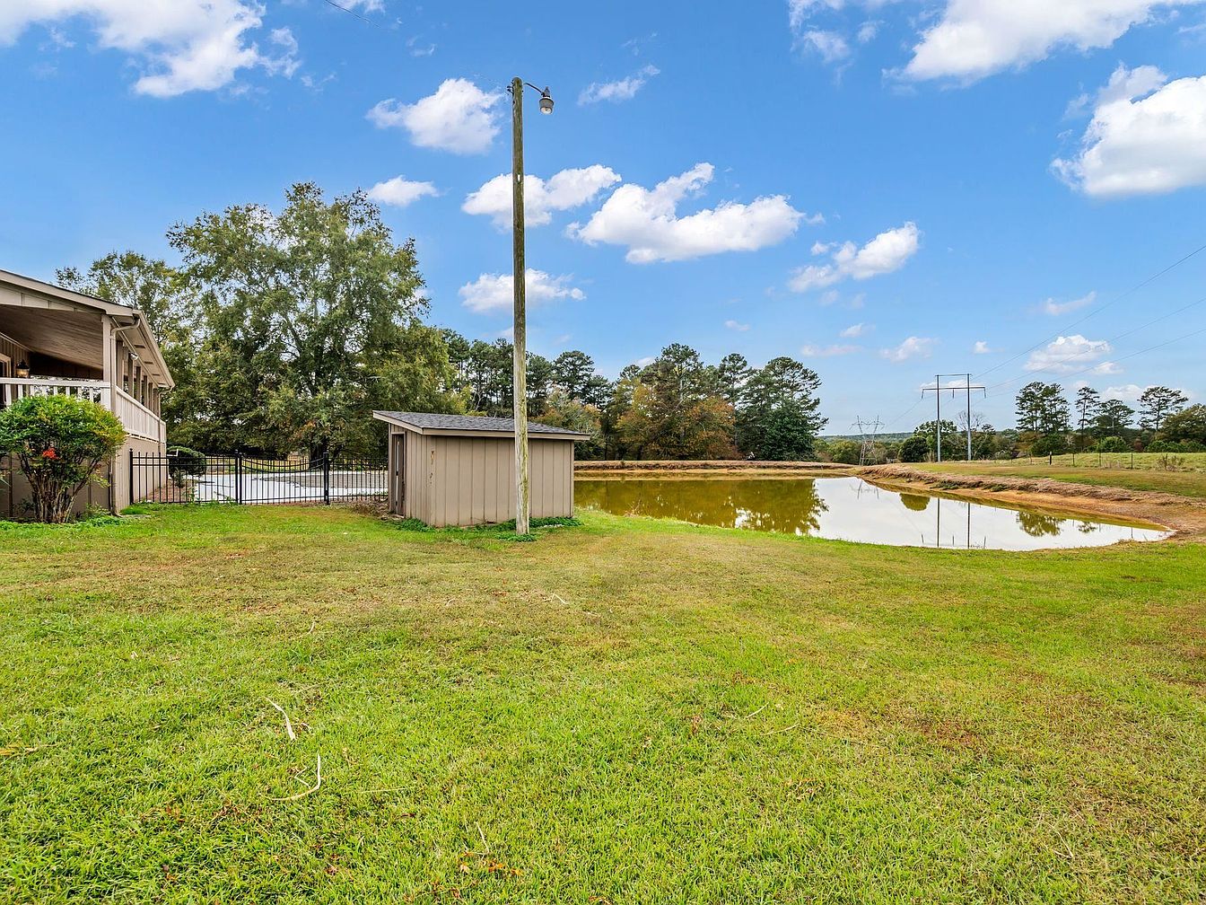 A spacious backyard features a gently sloping grassy lawn leading to a small pond bordered by earth and reflecting a blue sky dotted with clouds. On the left, part of a covered porch with white railings and posts extends from the house, adjacent to a black iron fence and gates. A simple wooden shed with a sloped roof is near the center, and a tall utility pole rises behind it. Lush trees frame the scene, providing a natural, rural atmosphere, while open pastureland and distant power lines hint at a serene, countryside setting.