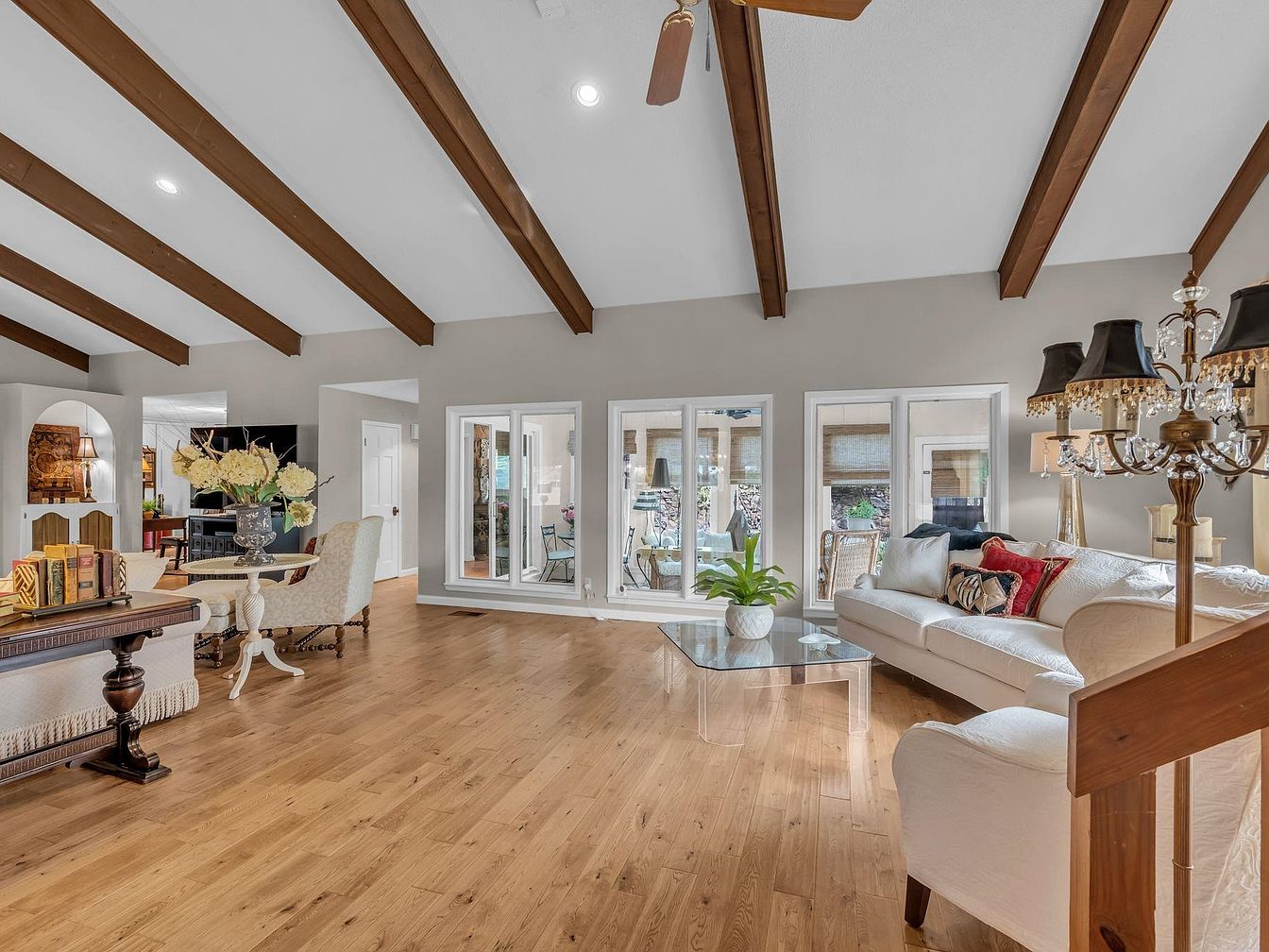 Spacious living area with light wood flooring and an exposed ceiling of wood beams contrasted against a white ceiling. A large, comfortable white sectional sofa sits against a gray-toned wall, adorned with a collection of silky red and patterned pillows. A clear glass coffee table with a potted plant rests in the center, contributing a touch of greenery. Ample natural light pours in through four tall windows, illuminating the room and revealing a glimpse of the sunroom beyond. Decor elements include an elegant floral centerpiece on a round table, antique books, a crystal chandelier lamp, and soft, upholstered armchairs, creating a warm, traditional ambiance.