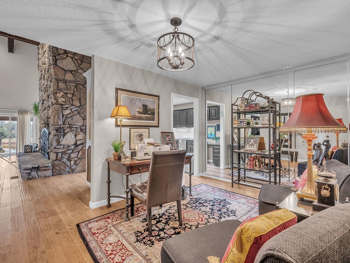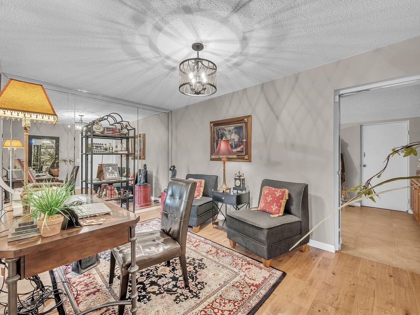 A tranquil home office characterized by soft gray walls and light hardwood flooring, exuding a cozy yet elegant atmosphere. A wooden desk with a vintage lamp and a tufted leather chair anchors the space, resting atop an ornate area rug with intricate red, beige, and black patterns. Against the wall, two charcoal gray slipper chairs with decorative throw pillows flank a small table topped with a classic lamp and antique-inspired decor. Mirrored panels expand the room visually, reflecting a black etagere filled with books, artworks, and collectibles. Artwork in gilded frames and warm, layered lighting enhance the historic, inviting feel.