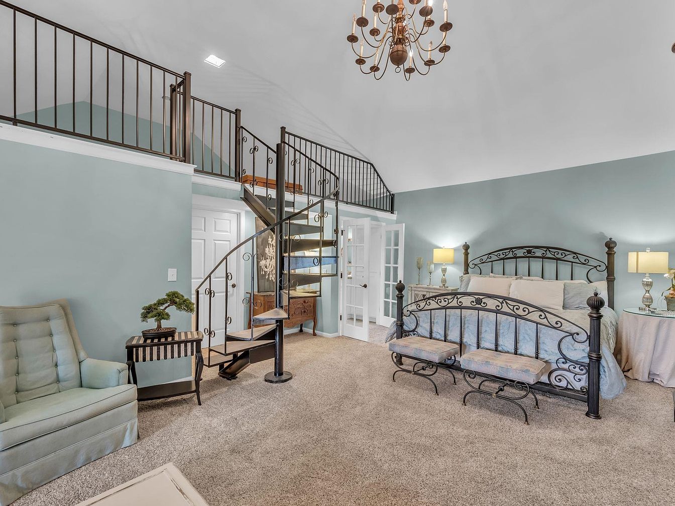 A spacious bedroom features a wrought iron bed with matching twin benches at the foot, both embellished with scrollwork. Soft blue walls and plush light tan carpeting create a calming, cohesive color palette. A unique spiral staircase with iron railings leads up to a mezzanine or loft area, enclosed by dark metal balustrades, adding architectural intrigue. The room is furnished with a pastel blue tufted armchair beside a striped black-and-white side table topped with a small bonsai tree, offering a touch of greenery. Matching lamps on elegant bedside tables cast warm, ambient light, while a grand chandelier hangs from the vaulted ceiling, adding vintage charm.