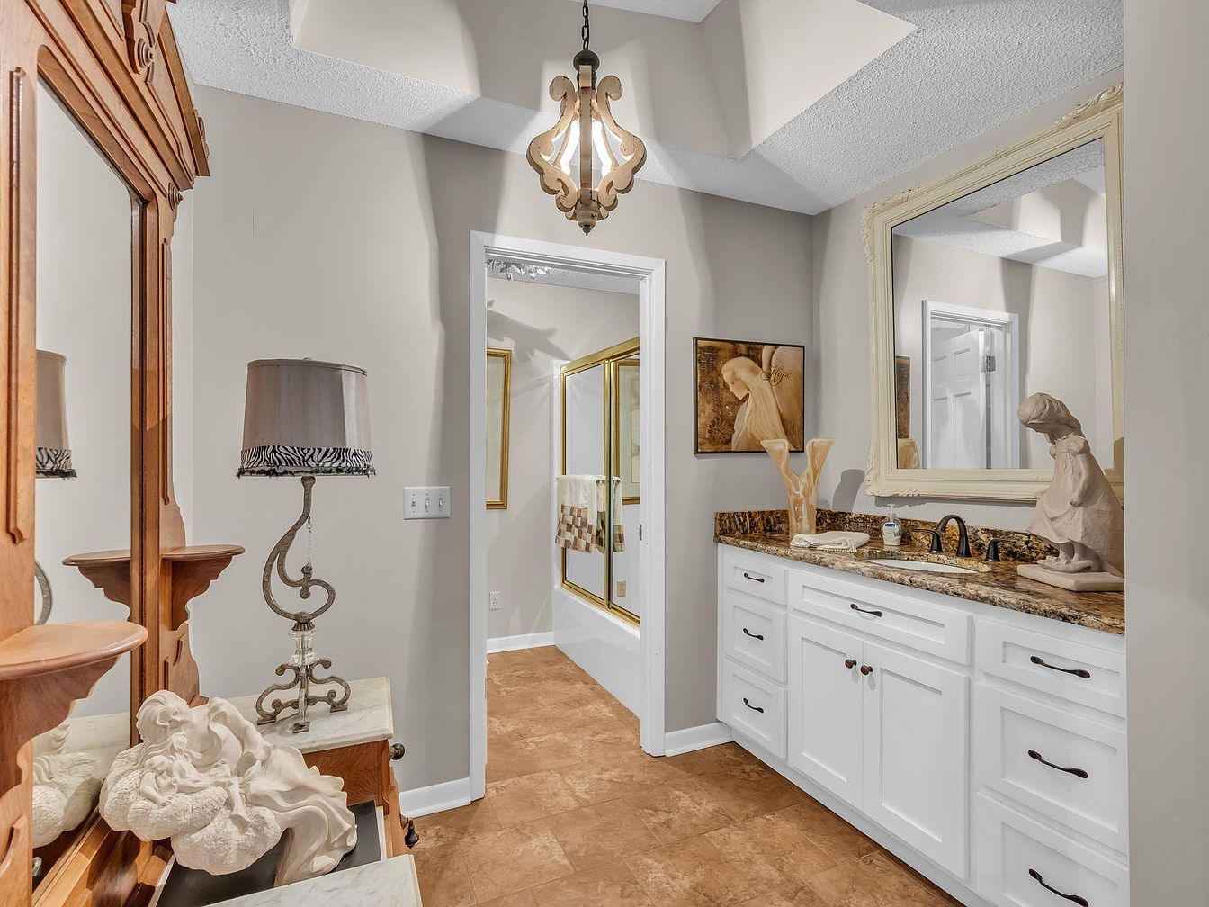 This space features a long granite countertop with an undermount sink set atop white cabinetry accented by dark bronze hardware. Above the counter is a large, ornate, cream-colored framed mirror. Decorative elements include a sculpted figurine, a modern table lamp with a zebra-trimmed shade, and a soft, sculpted textile piece on a small Victorian sideboard. Neutral-colored walls and tan tiled floors create a calm atmosphere, enhanced by soft lighting from a unique, sculptural chandelier. The area extends toward a bathing alcove with gold-edged glass doors, while warm, traditional accents reflect a blend of historic and modern aesthetics.