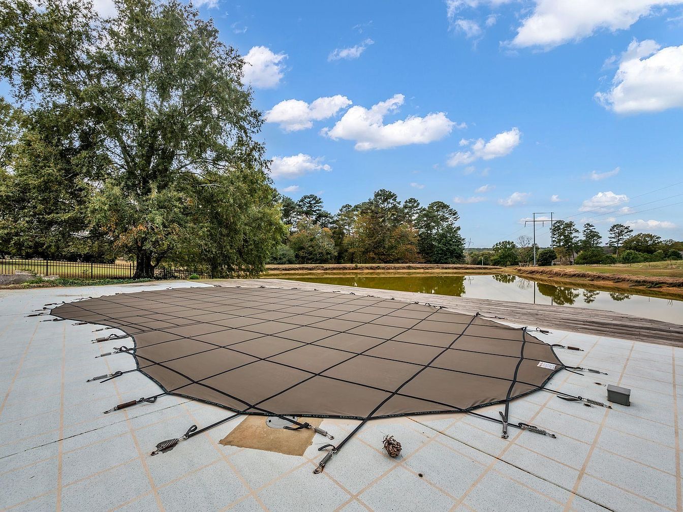 A rectangular pool is covered for off-season with a taut, brown safety cover secured by black grid lines and metal latches. Pale concrete paving surrounds the pool, its surface patterned with subtle diagonal lines. Beyond the pool area is a tranquil natural pond bordered by grassy banks, reflecting the trees, sky, and distant power lines. The setting is open and airy, combining pastoral views with leisure space. Mature trees provide ample shade and a soft green buffer between the terrace and the surrounding landscape. The overall atmosphere is serene and inviting, perfect for relaxation or hosting outdoor gatherings.