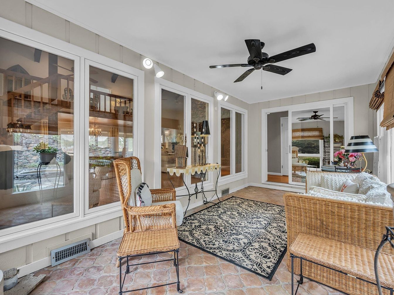 A bright sunroom features large windows along two walls, allowing ample natural light and offering views into the house and outside. The furnishings include wicker chairs and a matching bench with neutral cushions, arranged around a black-and-white patterned area rug. The floor is covered with warm-toned tile, and the walls are painted a soft beige. A ceiling fan with black blades adds both comfort and contrast. Cozy accents such as a throw blanket, decorative pillows, and a small ornate side table with a lamp and fresh flowers help create an inviting, relaxed atmosphere.