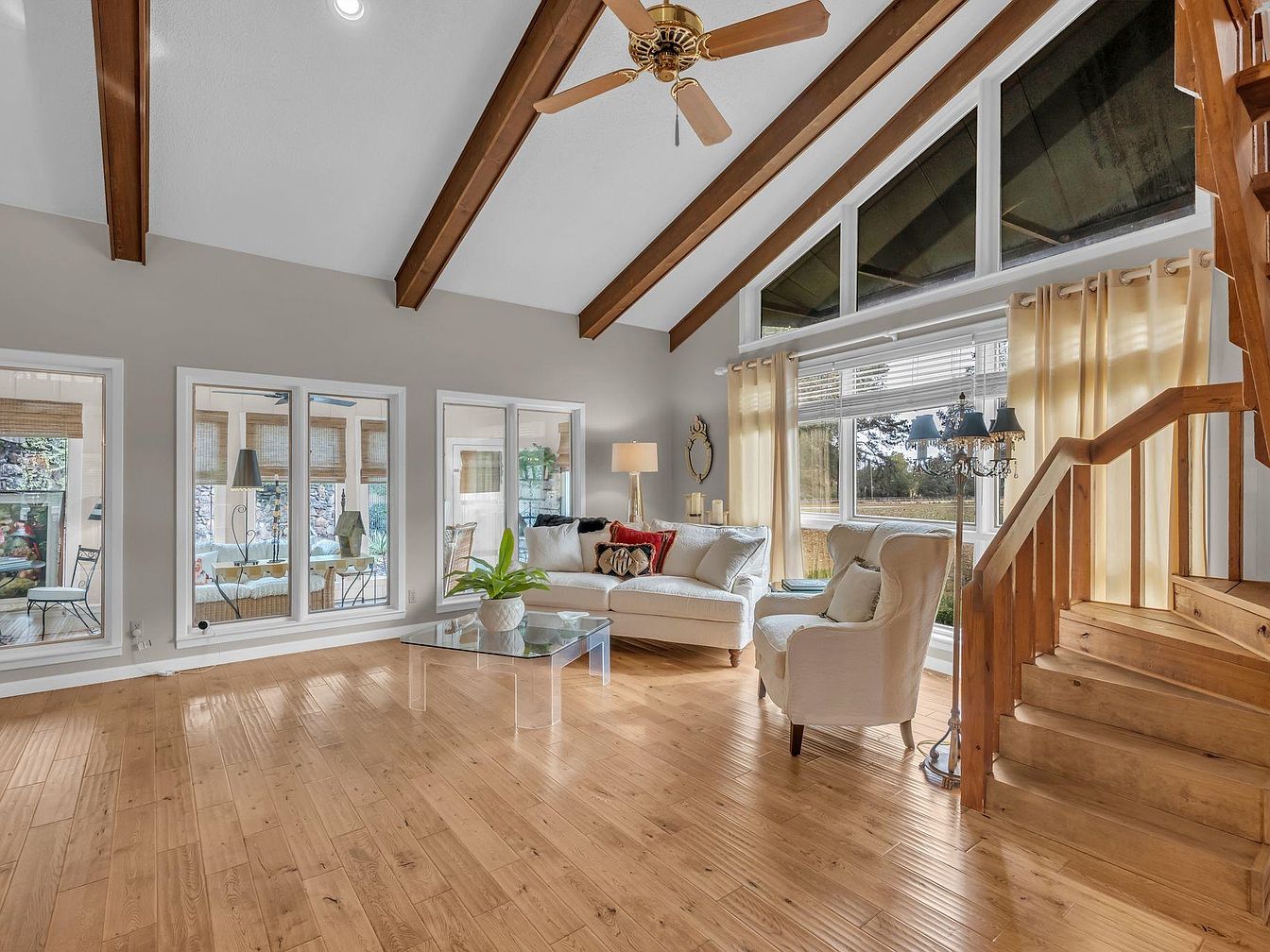 A spacious living room features vaulted ceilings with exposed wooden beams and a ceiling fan at the center. The space is illuminated by natural light pouring through expansive windows, including a row of large, triangular clerestory windows above. Pale beige walls and medium-toned hardwood floors provide a neutral backdrop. The furnishings are simple and inviting: a white sectional sofa, a plush cream armchair, and a transparent glass coffee table with a potted plant. Sheer beige curtains soften the sunlight at the windows, while a wooden staircase rises at the right, its banister complementing the beams. Decorative elements include lamps, pillows, and minimal accessories, creating a bright, airy, and welcoming atmosphere.