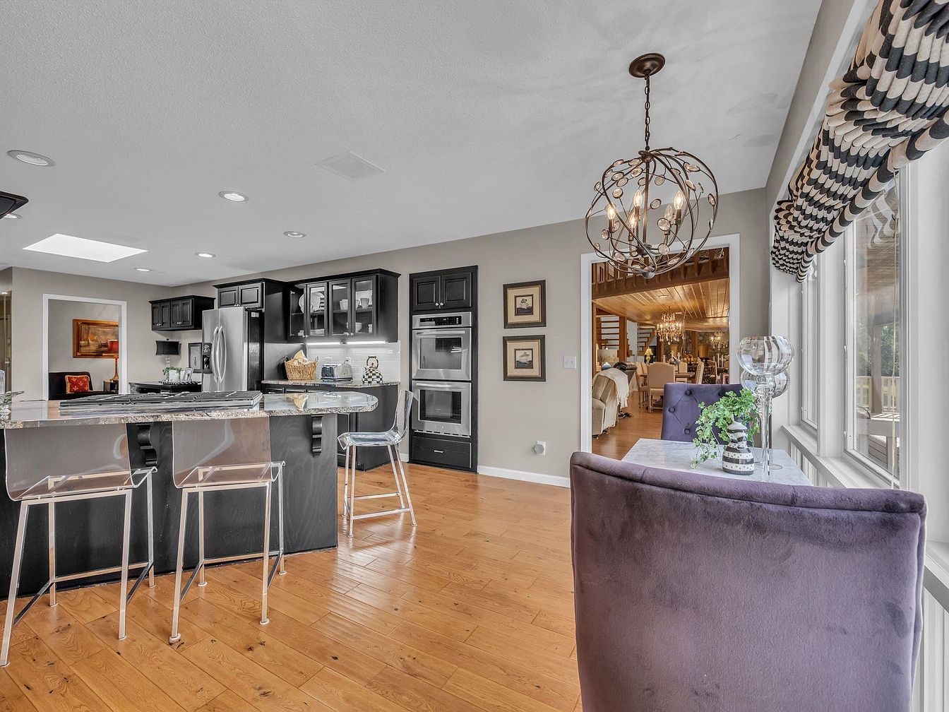 A spacious kitchen featuring a run of dark wood cabinets topped with speckled granite countertops, extending along one wall beneath a light, neutral ceiling. Recessed lighting and a central skylight provide illumination, while the backsplash consists of glossy white subway tiles. Stainless steel appliances, including a dishwasher, are seamlessly built in. The floor is made of wide-plank natural wood, adding warmth and contrast. To the left, a dining area with large windows guides the eye outdoors. Open shelves display glassware and decorative items, and a contemporary chandelier hangs above the dining table, completing the elegant yet inviting space.