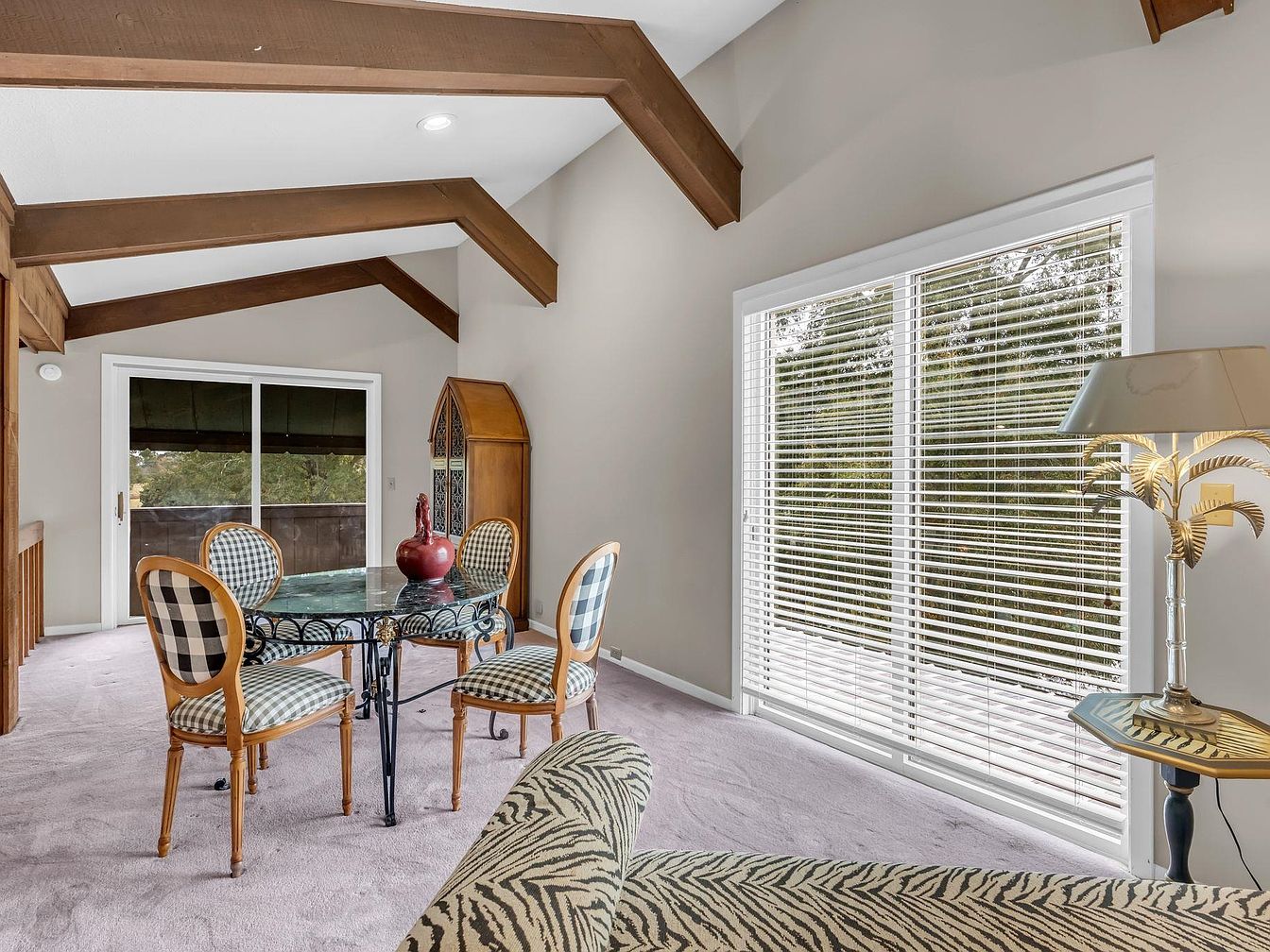 A cozy dining nook is situated near large windows with horizontal white blinds, allowing natural light to fill the space and offering views of lush greenery outside. The floor is covered in soft lavender carpeting, creating a sense of comfort. The centerpiece is a glass-topped dining table with ornate black metal legs and four classic wooden chairs, each with black-and-white checkered upholstery. An eclectic mix of furniture is evident, with a zebra-print cushioned bench and a unique gold leaf floor lamp nearby. Warm beige walls and exposed dark wood ceiling beams add character and warmth to the aesthetic.