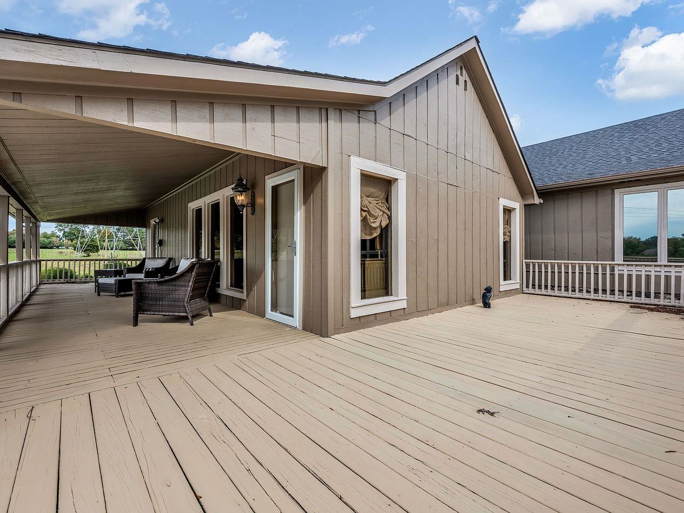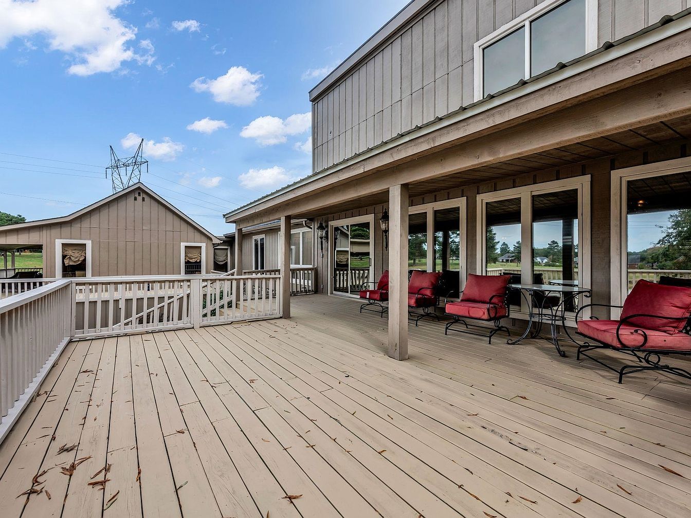 A spacious wooden porch stretches across the exterior, partially covered by an overhanging roof supported by sturdy posts. The light beige decking complements the vertical wooden siding of the house, which is painted in a soft taupe shade. Multiple glass-paned French doors line the house wall, reflecting the outdoor scenery and letting in plenty of light. On the covered section, several wrought iron chairs with plush red cushions are arranged beside small round tables, creating a welcoming seating area ideal for relaxation. White railings border the open section, leading to stairs and offering expansive views of the surrounding countryside.