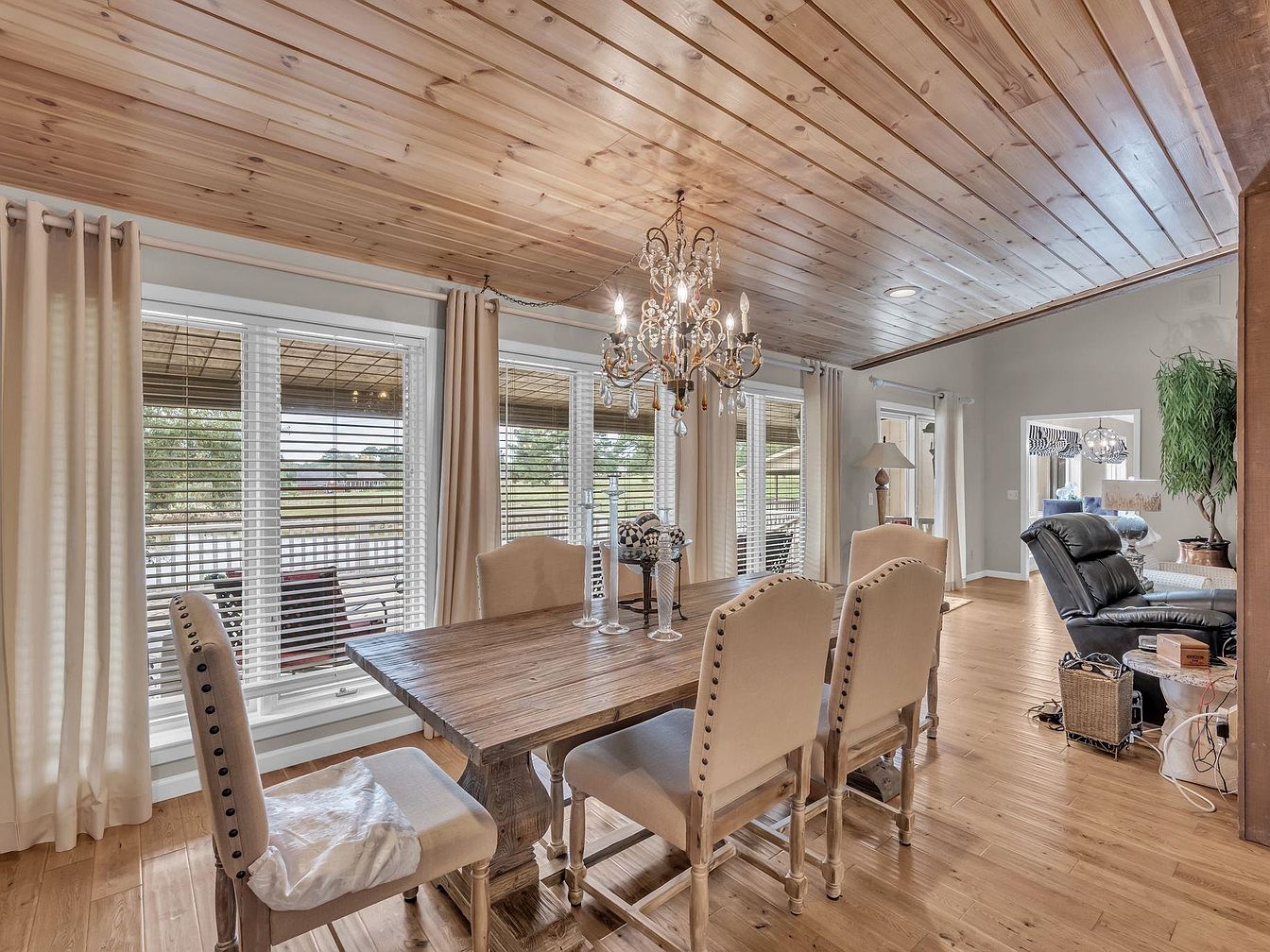 A spacious dining area features a long, rustic wooden table surrounded by six upholstered chairs with nailhead trim. The ceiling is finished in light natural wood planks, matching the glossy wood floor, creating a cohesive, warm atmosphere. Large windows dressed with beige curtains and white blinds allow an abundance of natural light to fill the space and offer a view of the porch and green landscape outside. A glittering chandelier hangs centrally above the table, lending elegance and vintage charm. The adjacent living area includes a black recliner and a leafy houseplant for a comfortable, lived-in feel.