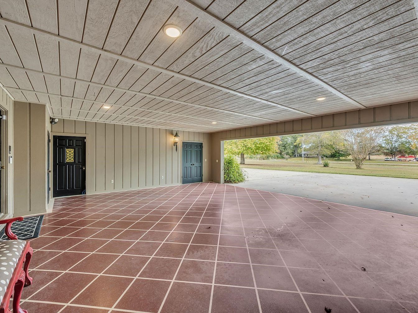 An expansive covered carport area is paved with reddish-brown tile flooring, each tile outlined by crisp white grout lines creating a grid pattern. The vertical wood-paneled walls are painted a soft taupe, lending a neutral and classic aesthetic, while the ceiling features parallel beams with recessed lighting for illumination. Two entry doors painted black with unique paneling are visible on the left, and a lantern-style exterior light fixture adds charm near the center door. The open wall on the right side frames a view of the driveway and a spacious green lawn dotted with mature trees, blending indoor and outdoor spaces.