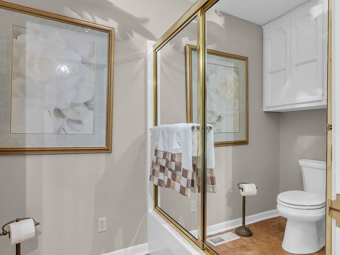 This bathroom features a neutral, calming palette with warm beige walls and white trim. A modern toilet sits in the corner beneath elegant white cabinetry that offers extra storage. The shower is enclosed by sliding glass doors framed in polished gold metal, adding a hint of sophistication to the space. A plush towel with a checkered pattern in white and tan hangs neatly on the shower door. Large framed floral artwork in pale, muted hues brings a serene, classic touch to the decor. The room is neatly organized, and the combination of soft colors creates a relaxing atmosphere.